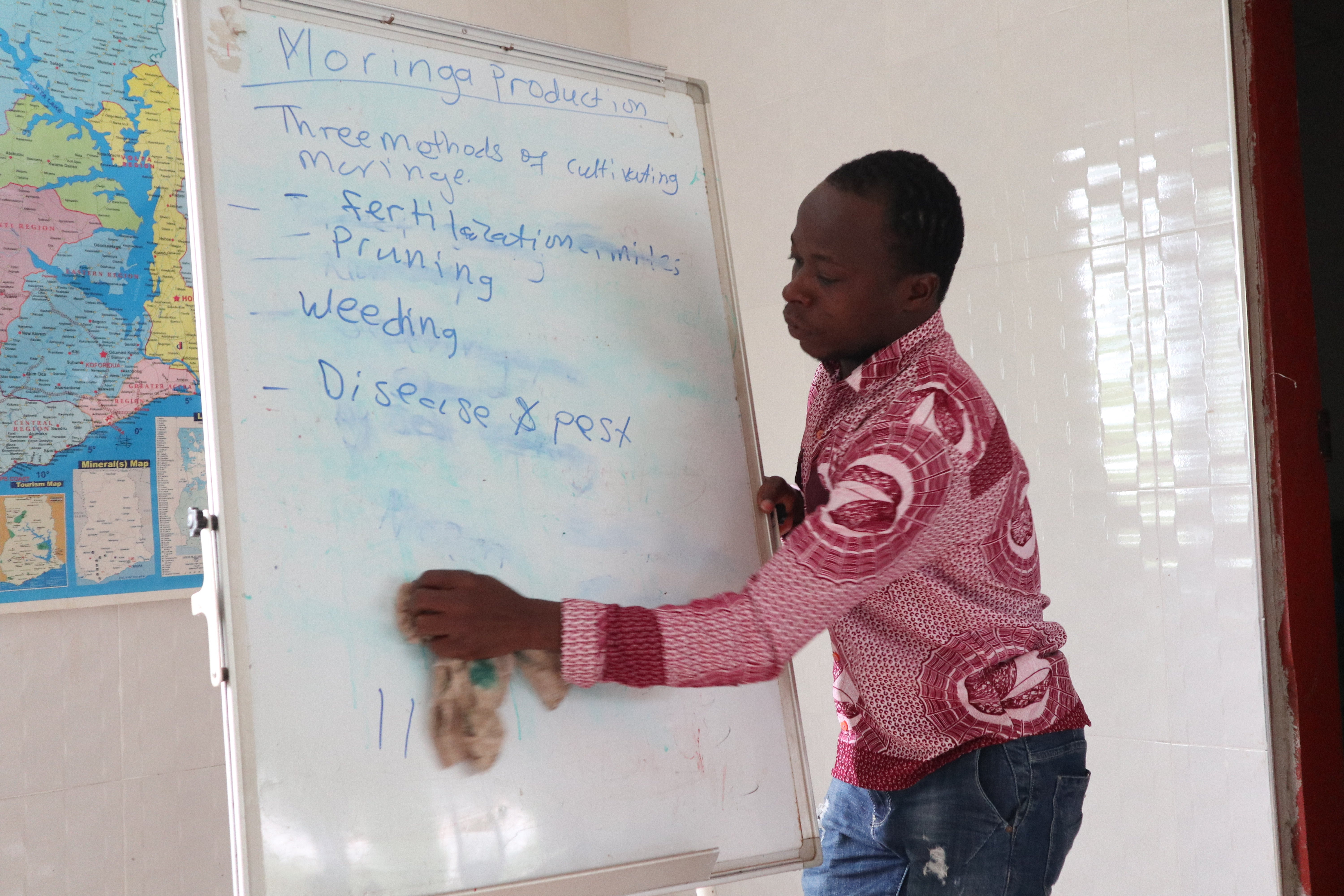 モリンガは、そのポテンシャルの高さから「奇跡の木」と呼ばれています。モリンガは木の葉・根・種など全部の部分を使うことができ、さらに可食植物の中でも最も栄養価が高いと言われています。それだけでなく、スギの木の50倍、一般植物の20倍の二酸化炭素を吸収すると言われています。環境にも、人々の健康にもいいと言われる植物を栽培する農家のお仕事を、今まで電子廃棄物を燃やして生活していた彼らに自分の仕事に誇りを持って取り組んでもらいたいという思いで、モリンガ栽培をすることを決めました。