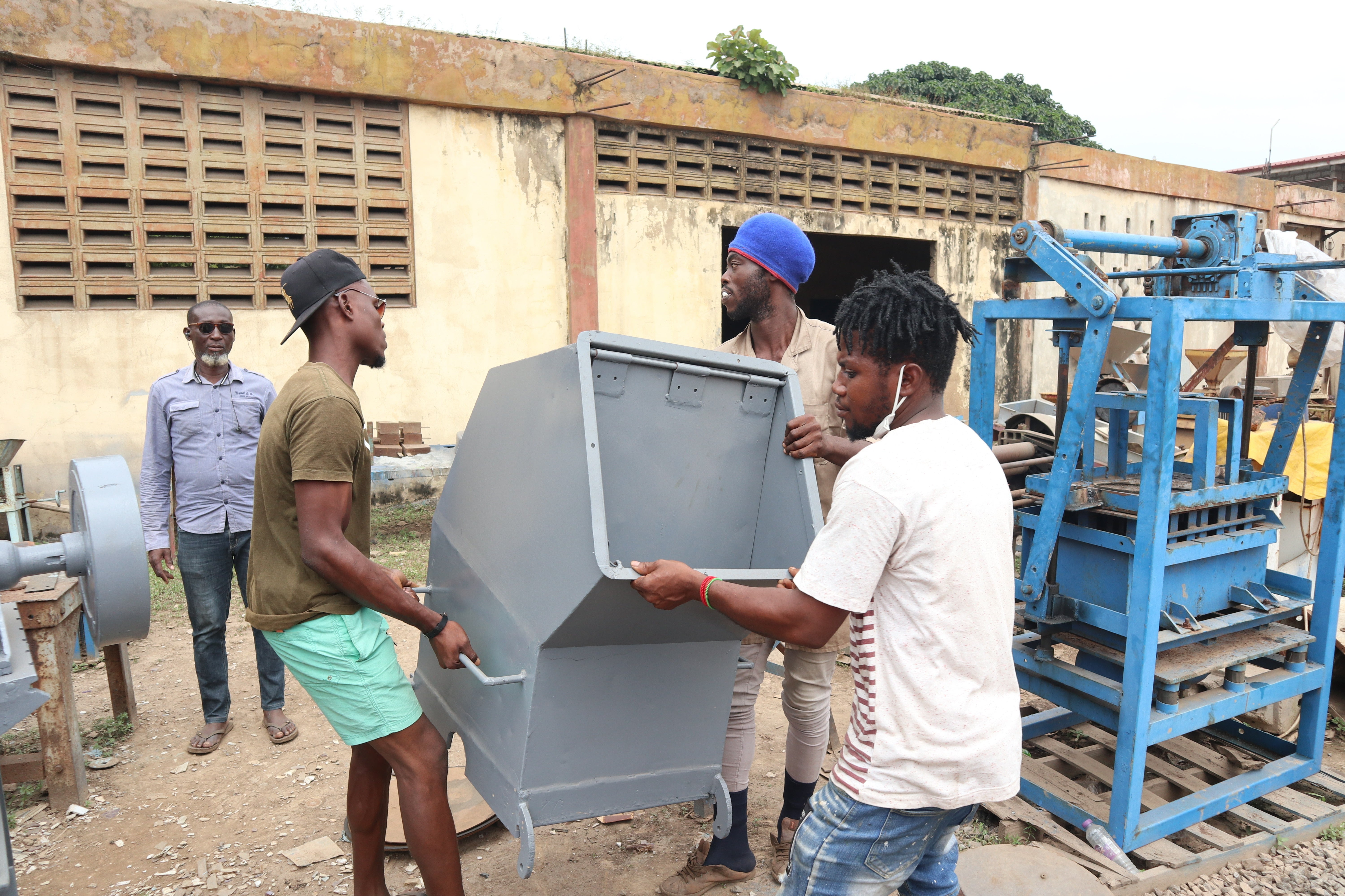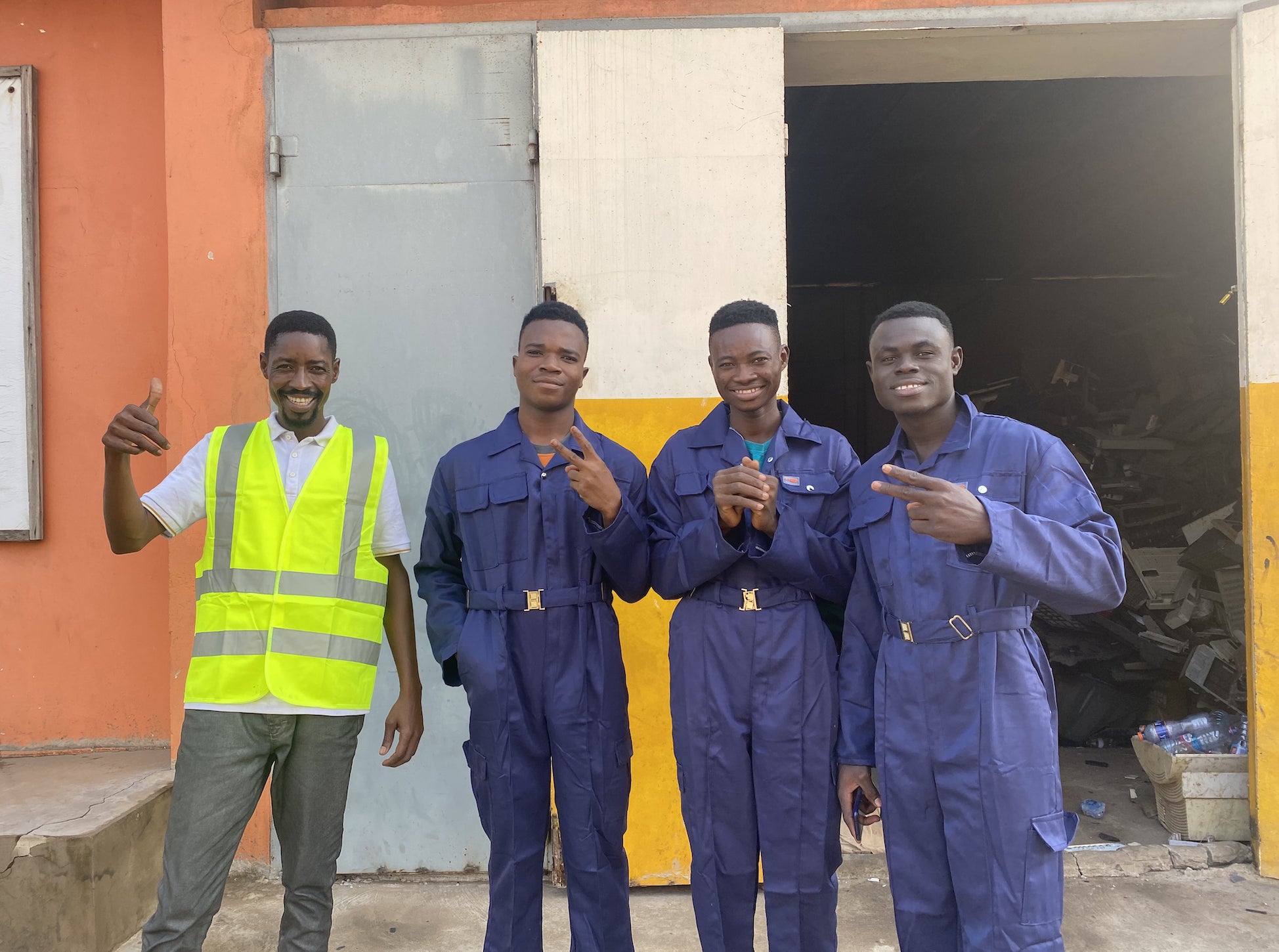 リサイクル工場にて、左から工場長のオラクル、サミュエル、デイビット、ゴッドソン