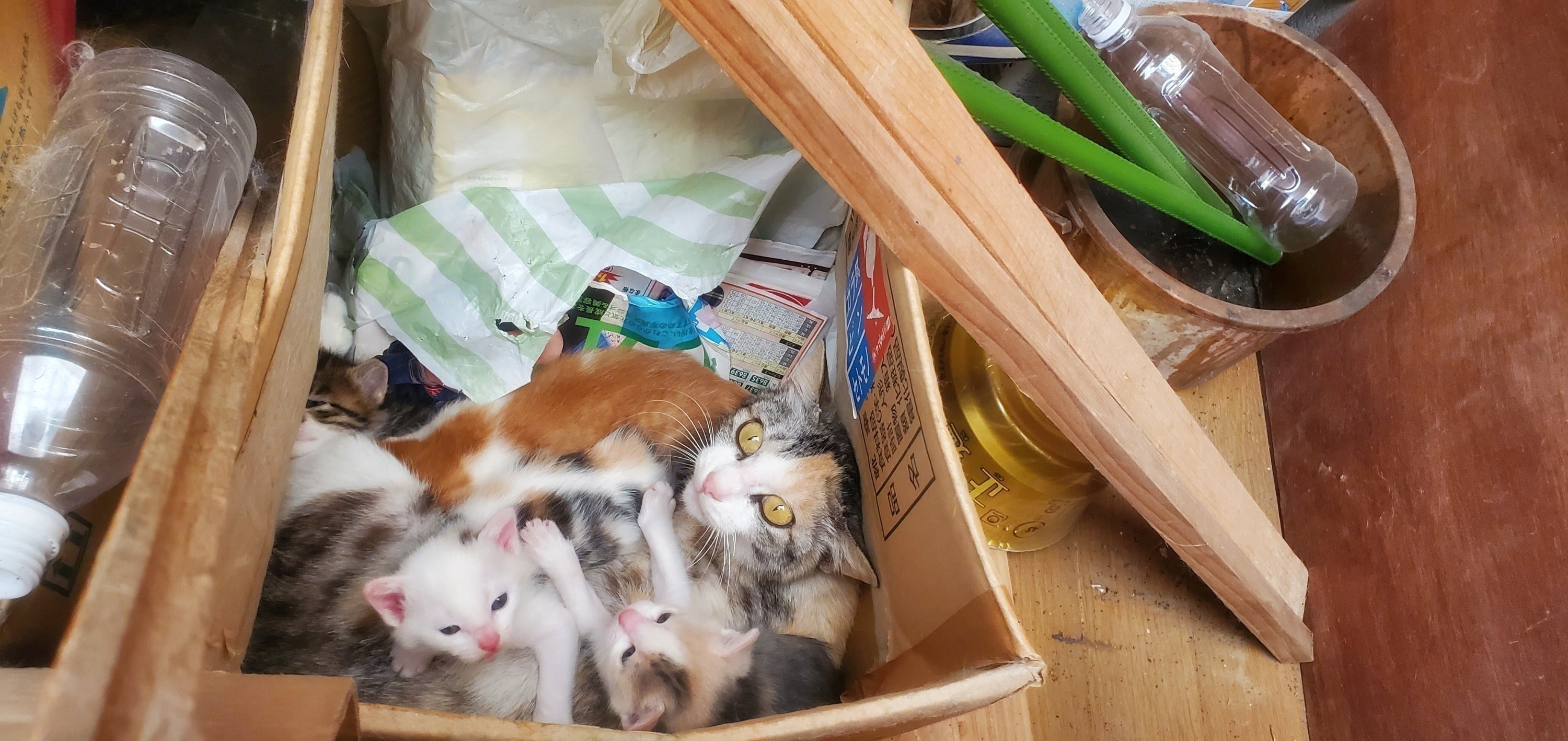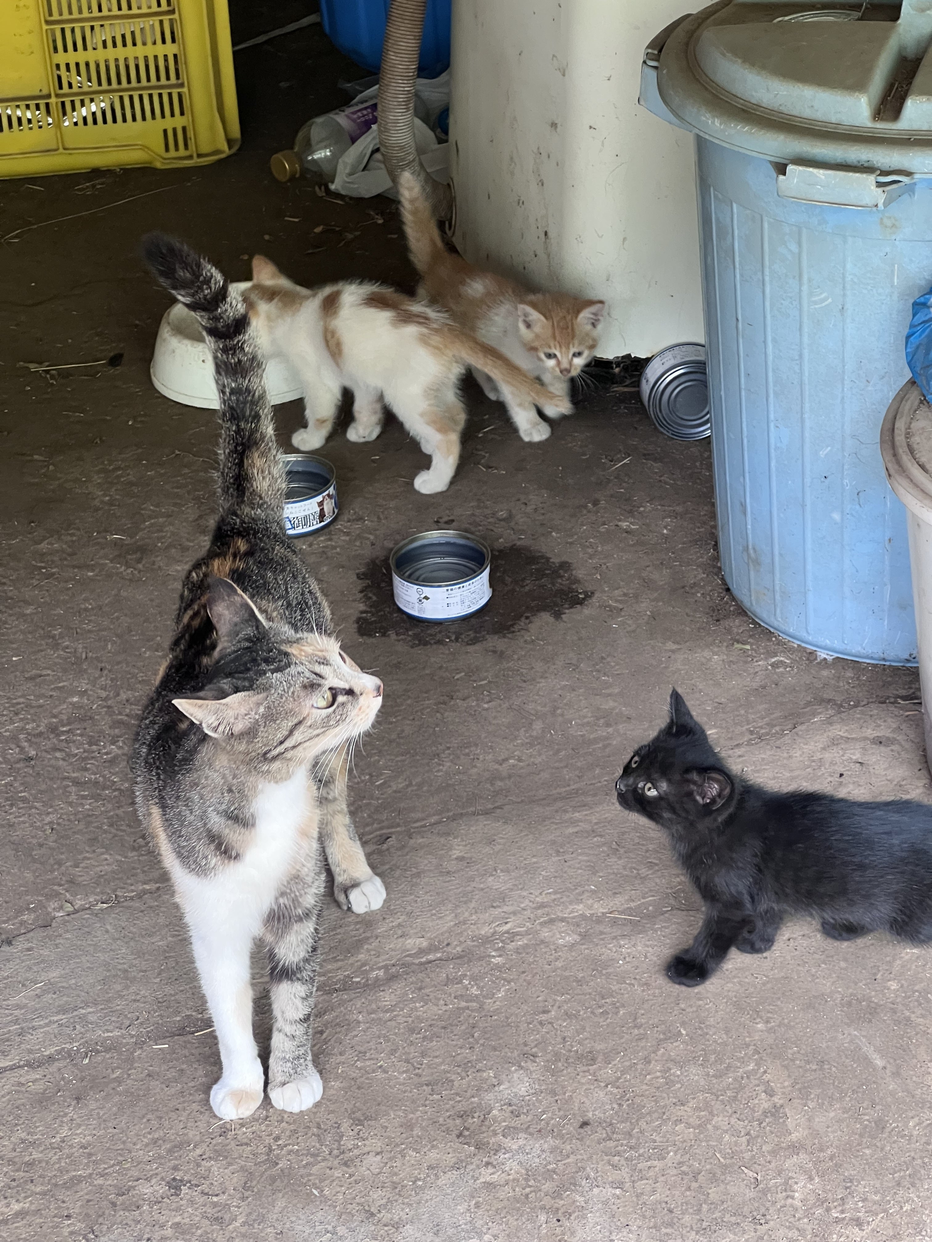 倉庫に棲みついた親子猫