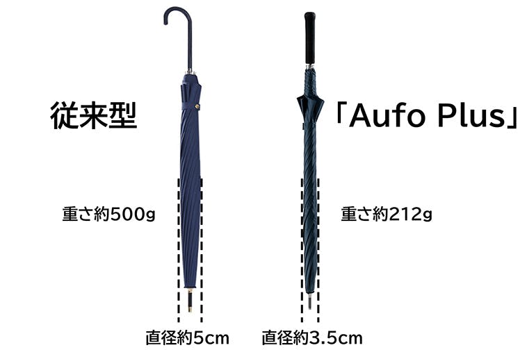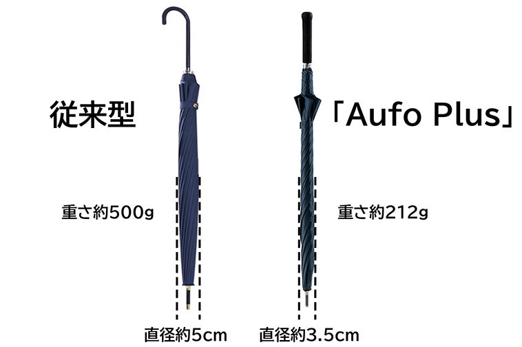 従来の傘は、直径5cm以上、重さ500g以上が一般的で、「Aufo Plus」は収納時の直径がわずか3.5cmとなり、重さも212gだけです。「大きくて重い」という従来型の欠点を解消し、「小さくて軽い」という新たな利用体験をもたらします。