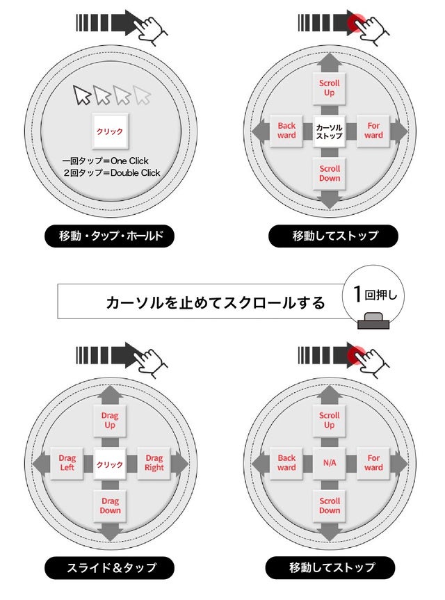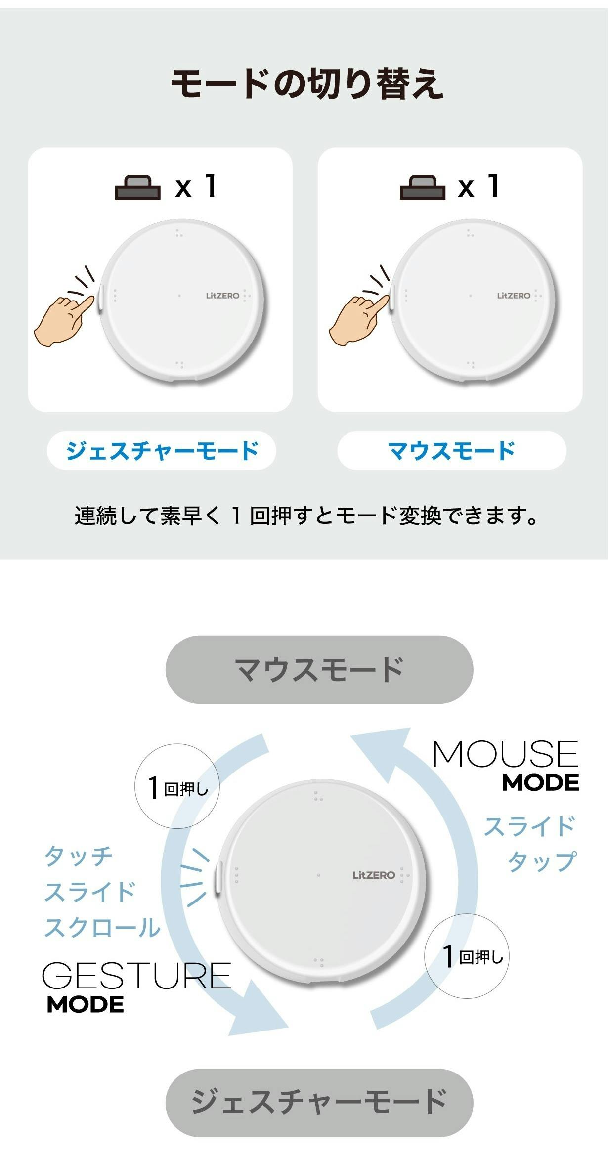 操作モードの切り替えだって簡単です。ボタンの1回押しでジェスチャーモードに、連続2回押しでマウスモードに切り替わるので必要に応じで切り替えながらお使いください。