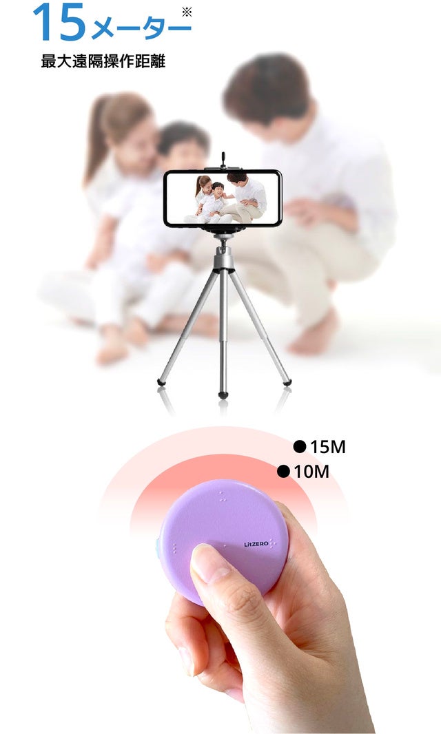 15mも離れた場所からデバイスを操作でき、離れたところから動画を撮影したいときや、プロジェクターを使っている時に大活躍してくれます。自宅やオフィスでデバイスから離れる際でも、「LitZERO 2」があれば手元で簡単に動作コントロールができます。