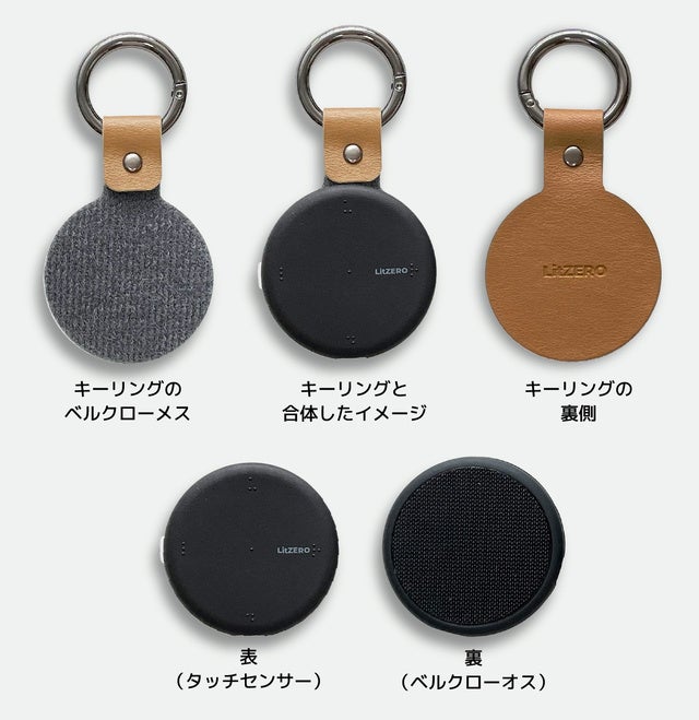 本体の裏側にベルクロ付きで、キーリングと合体して持ち歩いたり外して本体だけで使うことができます。