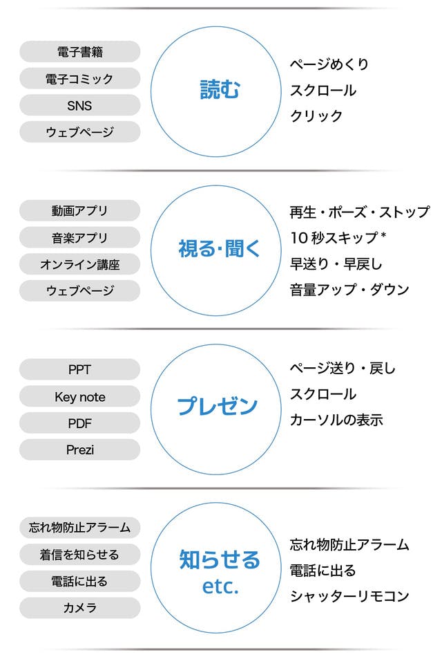 Bluetooth通信可能なオーディオ機器なら音楽やPodcastの再生、一時停止、次へ、前に、早戻し、早送り、10秒戻し・10秒飛ばし(アプリによっては30秒飛ばしなどになります)の他、スリープモードの解除も可能。もちろんYouTubeやNETFLIX、Amazon Prime Videoなど動画視聴にもオススメです。
