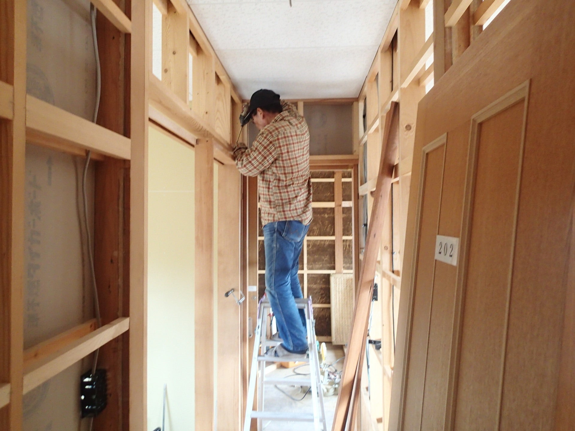本日の作業は会員の建具屋さんが、ドア枠を作っています。色々な職種の会員さんがおられるので、大変助かっています。