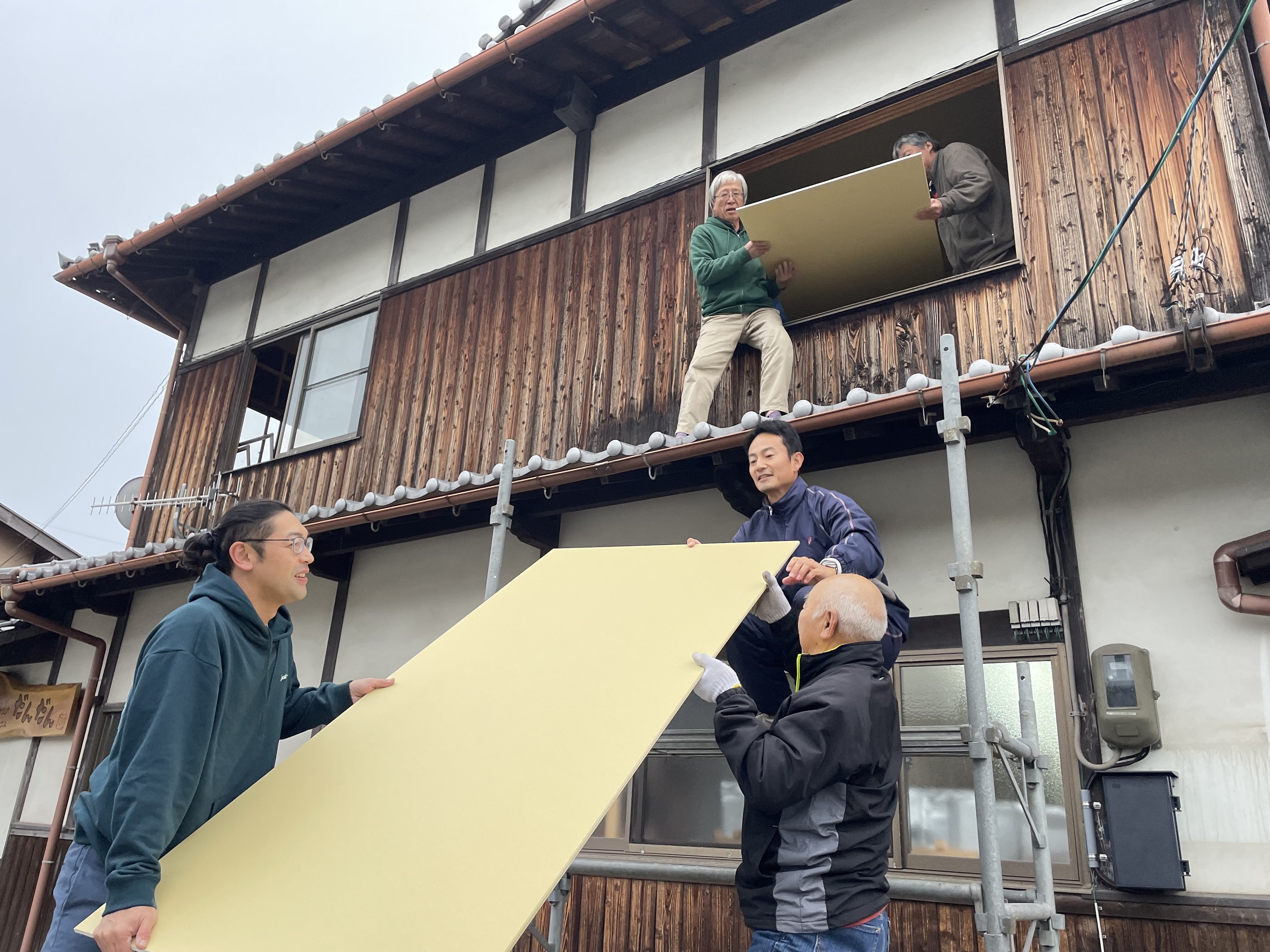 今日は当クラブの友好団体「江田島シーサポート」の皆さんに協力して頂いて、石膏ボード50枚の荷揚げをしました。階段を使うのは大変なので、車から直接2階に運び上げました。「シーサポート」には若い人が多いので、本当に助かります。