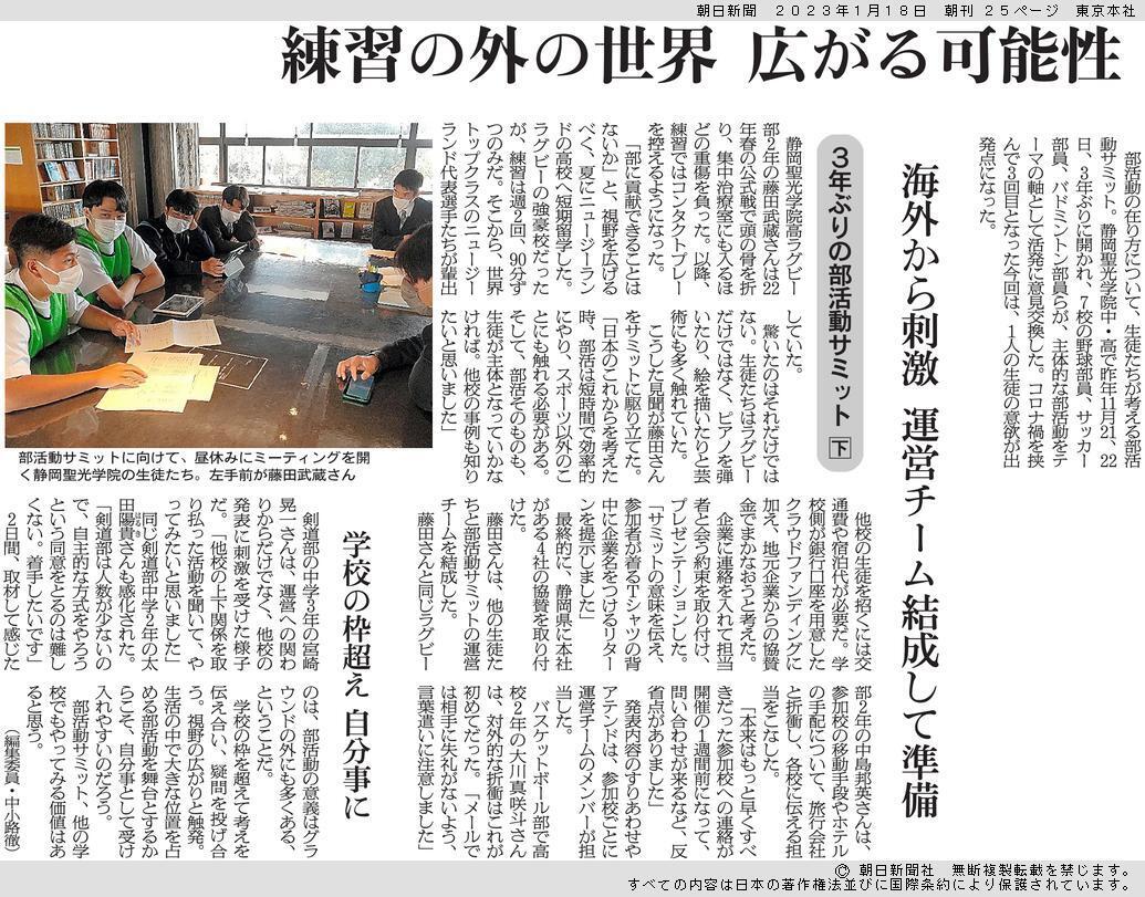 2023/01/21 11:55朝日新聞様に部活動サミットについて掲載していただきました。(その2)生徒のコメントが多く掲載されております。ぜひお目通しをお願いいたします。リターンの発送ですが、1月27日を予定しております、Tシャツ作成担当がインフルエンザに感染してしまいました。少々発送がずれ込むかもしれません。どうかご容赦ください。 もっと見る朝日新聞に掲載していただきました。