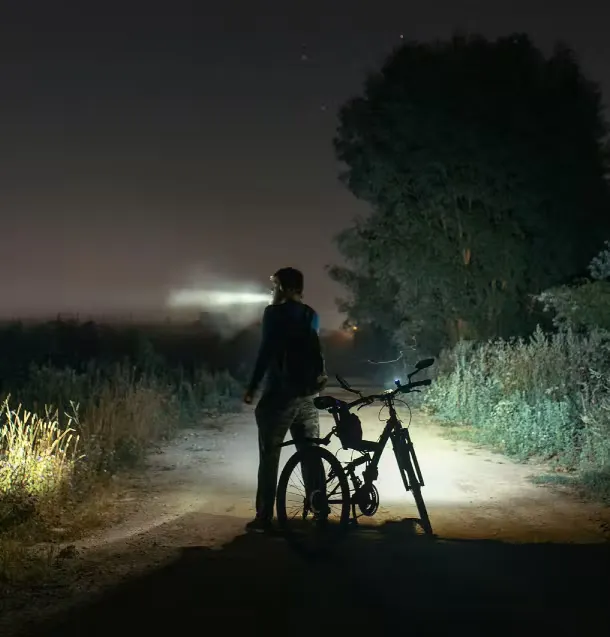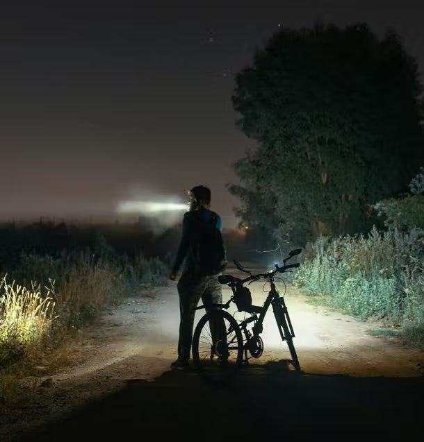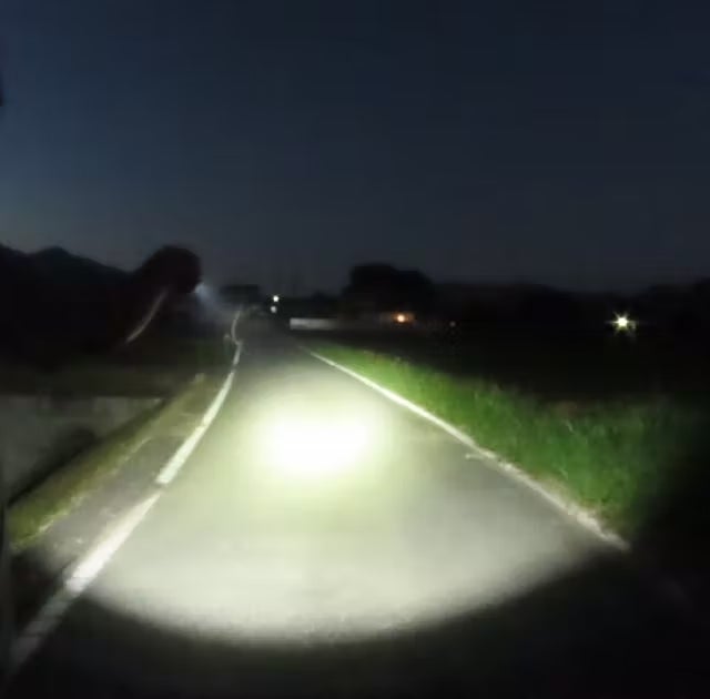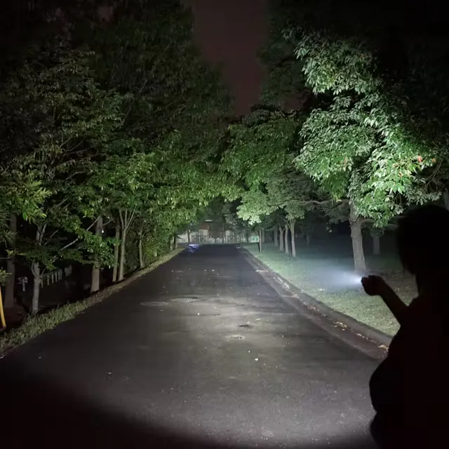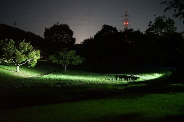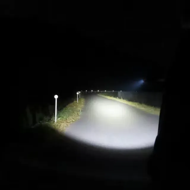 夜間の街灯がない道で点灯。しっかりと足元を確認できる明るさです。驚くほど遠くまでクリアに見通せるので少し暗い場所でも不安なく歩けます。夜道を歩く際には自分の足元を照らすことも大事ですが、明るいライトを持つことで周辺の車や自転車に早めに気がついてもらえるといった効果もあります。