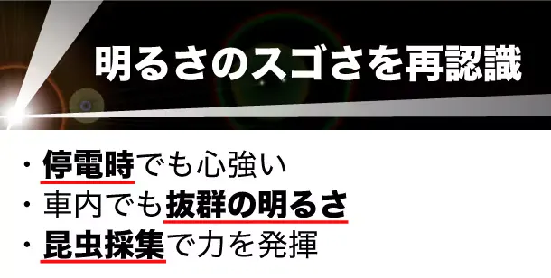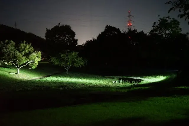 キャンプの夜などの昆虫採集にも。遠くまで届く明るさを利用して、茂みに入ることなく遠目から広範囲を探ることで効率よく行うことが可能です。