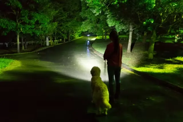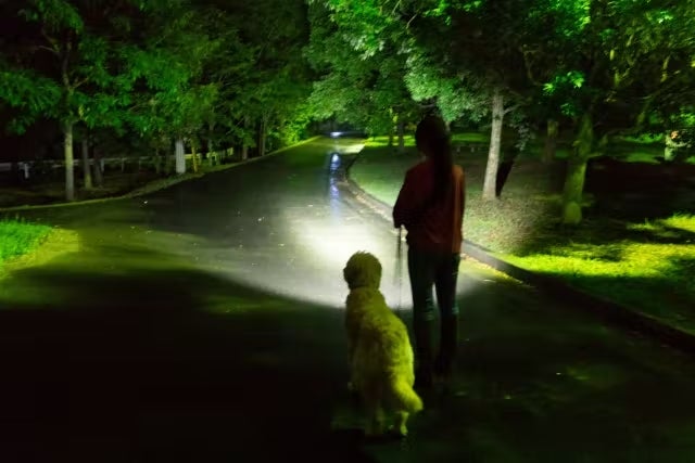 夜間の犬の散歩でも、「Sharvol S1」なら広範囲を明るく照らしてくれます。周りからもよく見えるので、車、自転車から早めに気がついてもらえる効果も。