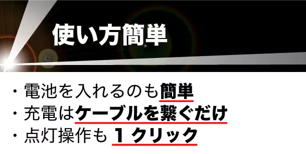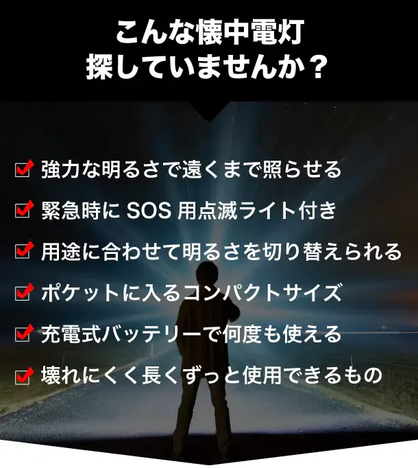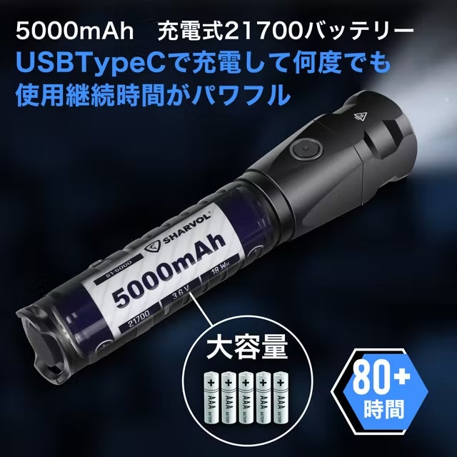 懐中電灯は明るくてらすことはもちろん、長時間の点灯が可能であることも重要です。充電忘れや電池切れなどで突然使えなくなる経験をしたことはありませんか? 「 Sharvol S1」 は大容量バッテリー搭載でフル充電時のエコモードでは約80時間使用することができます。
