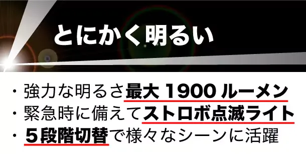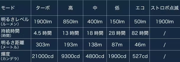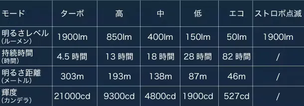〇LED明るさ:1900ルーメン距離:303m輝度:21000カンデラ