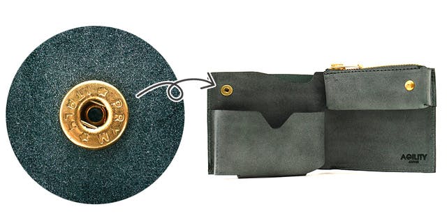 シンプルなスクエアフォルムの2つ折り財布(横開き・お札は上から入る)をベースにしているので、違和感なく使える財布に仕上げました。