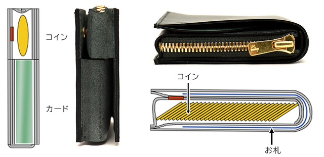このロフト構造にならい、厚みの出やすい「小銭」・「カード」を重ねることなく、「上下で分ける」2層式にする事で厚みの軽減に成功。