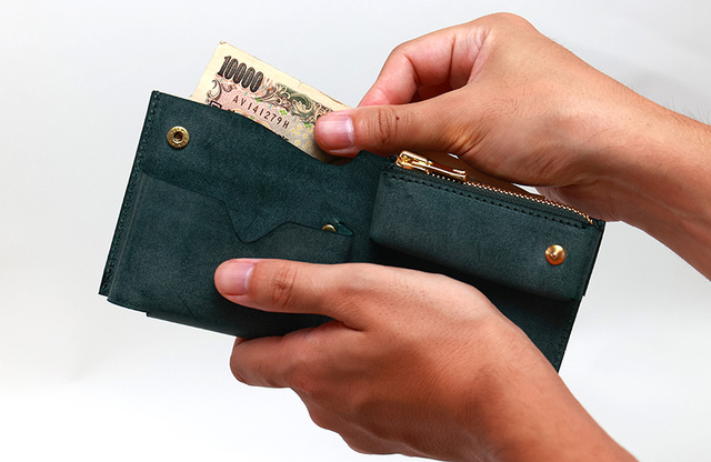 カードも現金も遠慮なく収納でき、コンパクトで厚みが変わらない二つ折り財布。