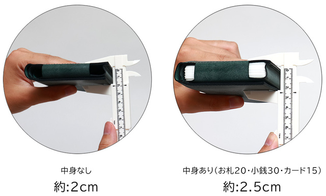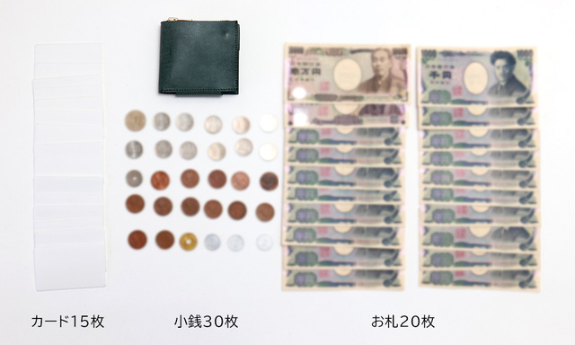 カード15枚・小銭30枚・お札20枚程度が収納できる設計です。