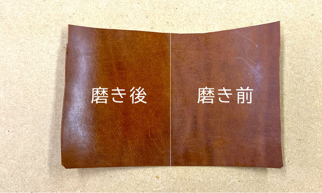 染料とオイル、ワックスをたっぷりと革の芯まで染み込ませ、さらに表面にもワックス仕上げをすることで、使用していくと摩擦により宝石のような艶が生まれます。