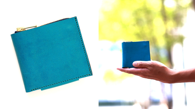 シンプルなスクエアフォルムの2つ折り財布(横開き・お札は上から入る)をベースにしているので、違和感なく使える財布に仕上げました。