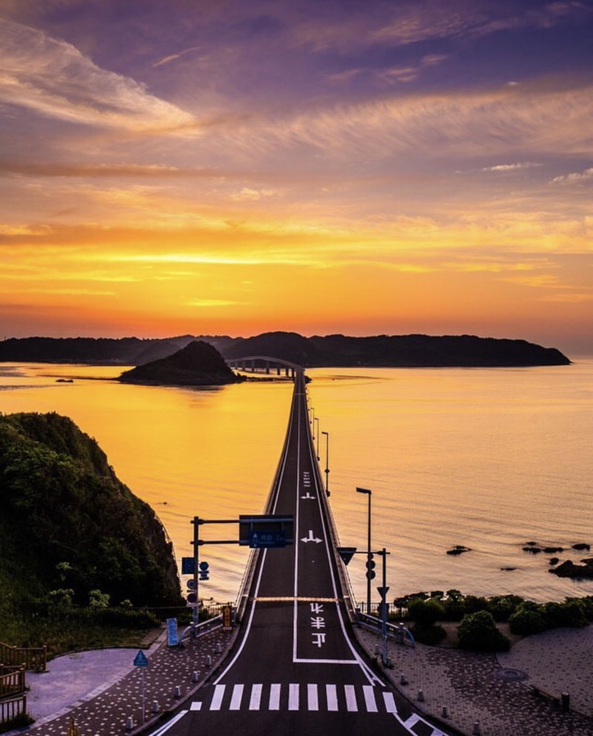 角島大橋から見る夕日は海一帯が真っ赤に染まり