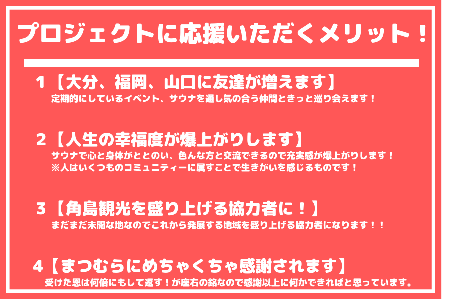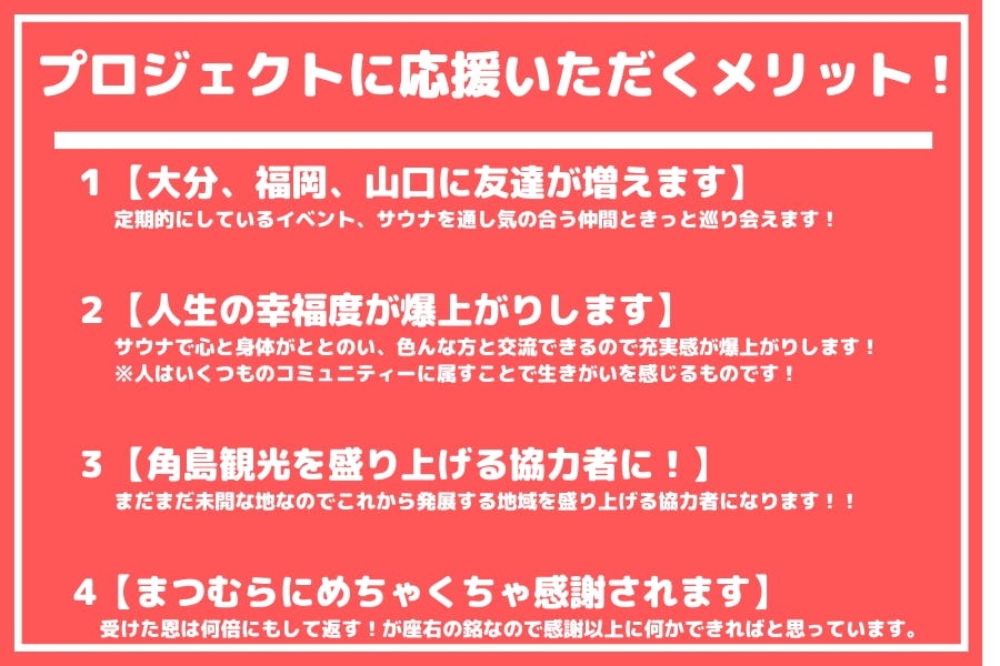 2022/11/24 19:00今回10月14日からスタートしたクラウドファンディングが133名の方にご支援いただきお陰様で153%(101万555円を集める事ができ無事11月14日に終える事ができました!目標としていた100%(66万円)には多くの方に 拡散、ご支援いただき8日間で達成する事ができ 本当に感謝しかありません。ありがとうございます‼これからは福岡、山口、大分でテントサウナイベントをしていきリターンを返していきます!※その他のリターンについてはご都合の いい日をご連絡ください。イベントの詳細はこちらのオープンチャットにて ご連絡するので入っていただけたらと思います!・オープンチャット→「角島プロジェクト」https://line.me/ti/g2/80MueUklfBwq_jZuxLwxRPKY3uoZw0siWv7Pxw?utm_source=invitation&utm_medium=link_copy&utm_campaign=default※定期的にイベントを開催していきます! ご都合いい時ご参加ください! もっと見る