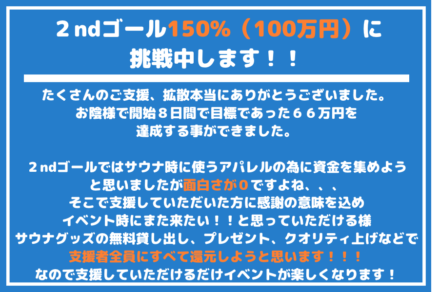 今回の企画であるテントサウナ購入では現在も毎月行っているイベントにプラスした