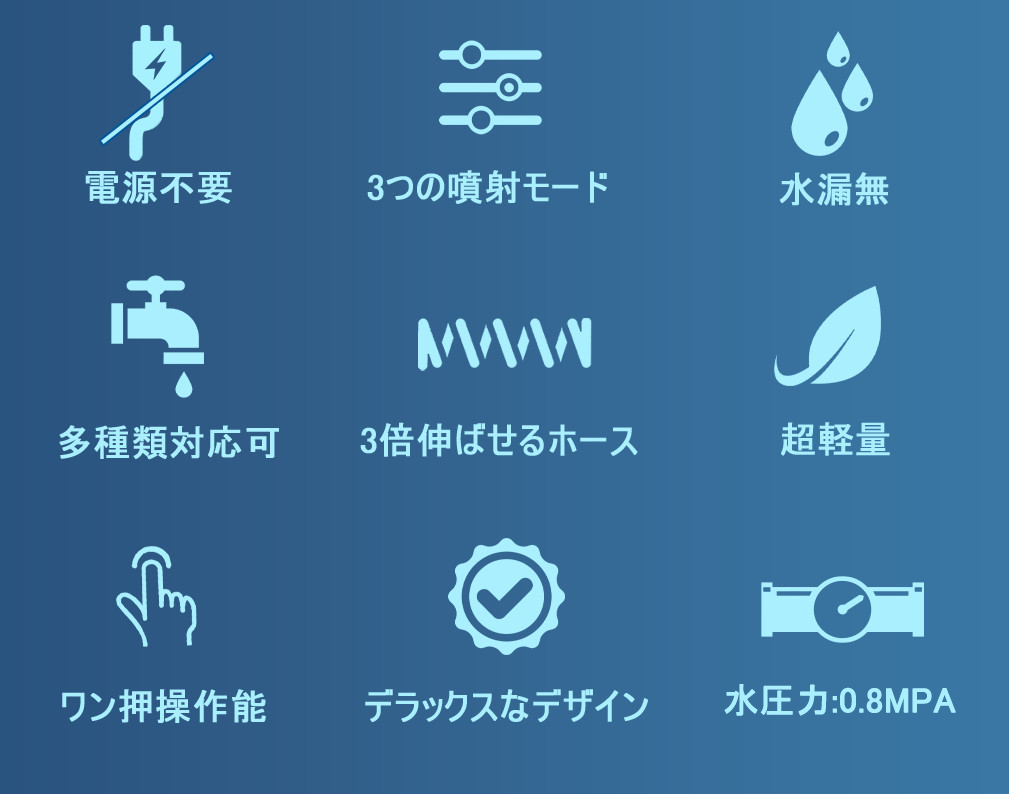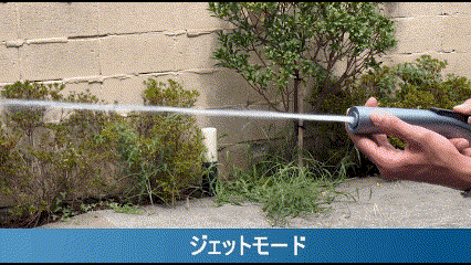 水圧力は0.8Mpa~からとなり、勢いよく水を噴射する高圧ジェットが特徴。