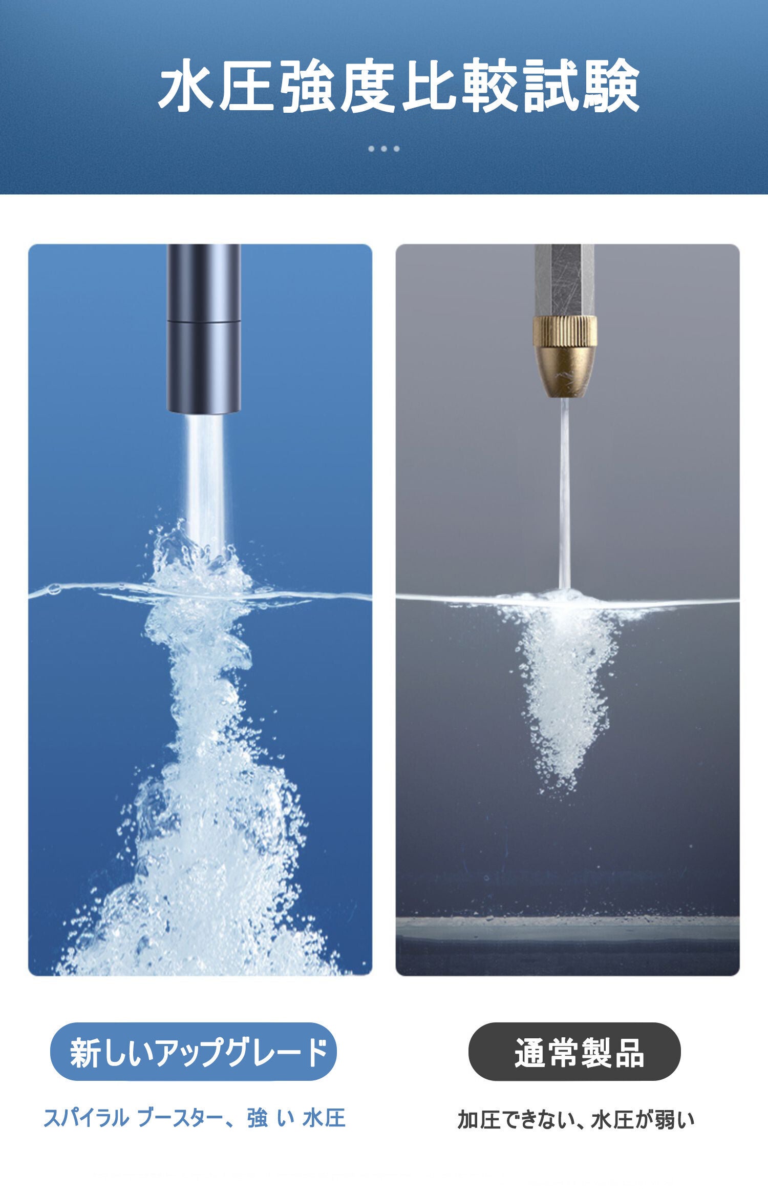 同じ水量でも面積が小さくなることによって内部の圧力が高まり、水の勢いが強くなる仕組みを応用しています。そのおかげで、家庭の水道でも驚きの高圧噴射が可能です。