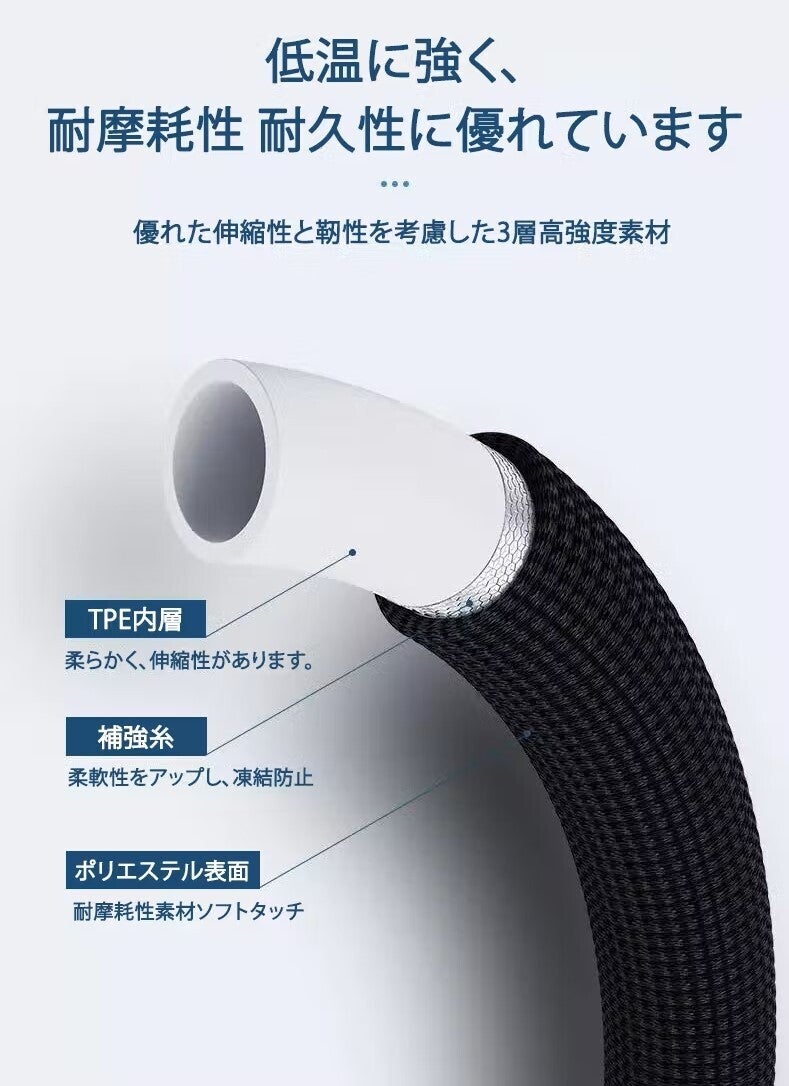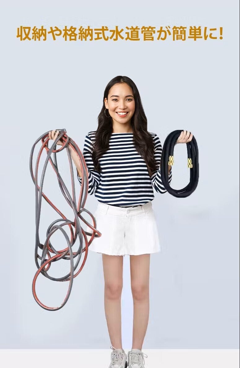 通常のホースは塩化ビニール製で素材が硬く、巻き取りも困難で見栄えが悪い。