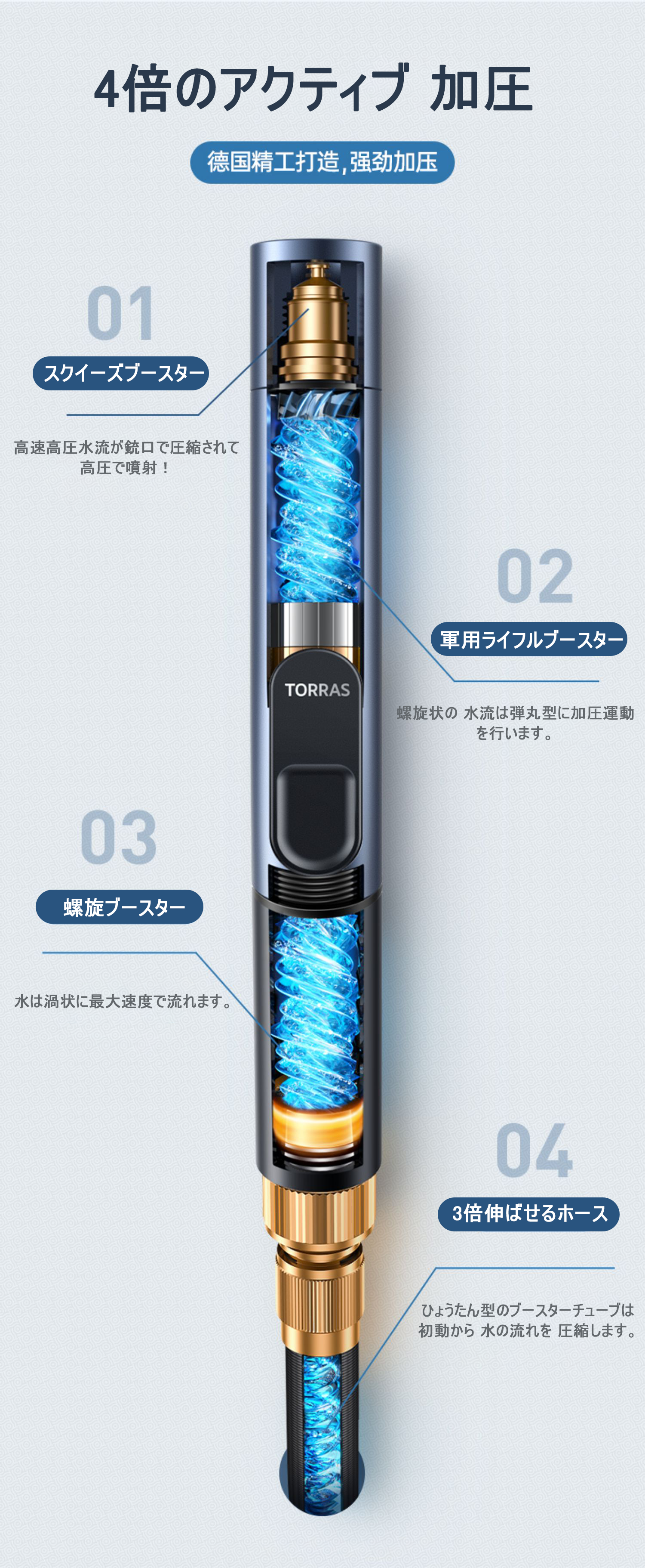 ホース内に流れる水に旋回運動を与えて加速させ、水流は渦を巻きつつ圧力も増していきます。