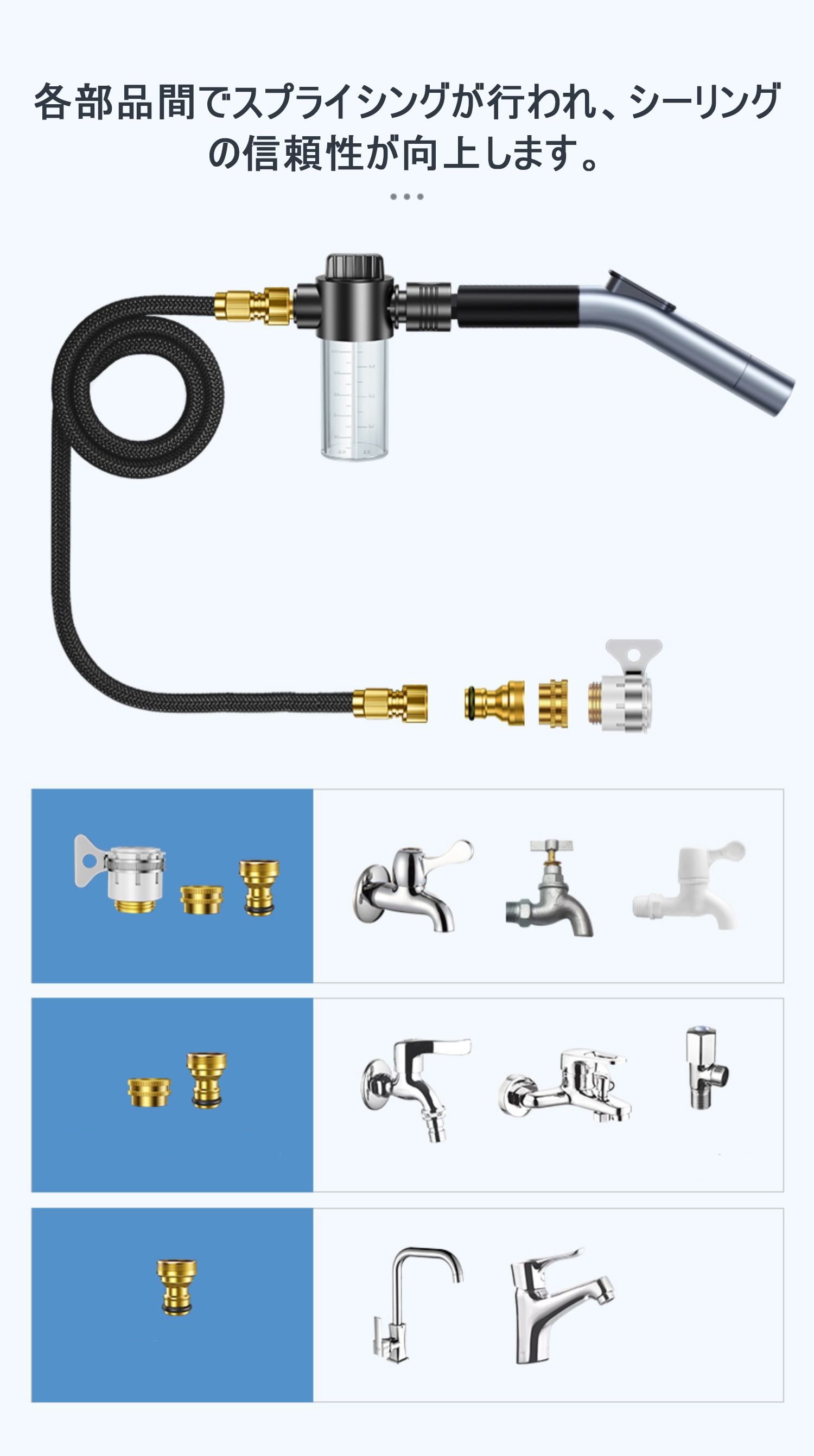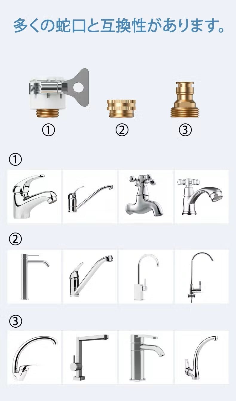 ⁂付属品:本体、ホース、メタルネジ付蛇口ニップル、ネジ取出しニップル、丸形水栓コネクター、収納バッグ、蛇口シールテープ、説明書日本語。