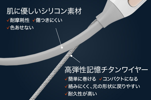 肌に触れるものだから、素材にもこだわりました。ネックストラップ部分は肌に優しいシリコン素材を使用。