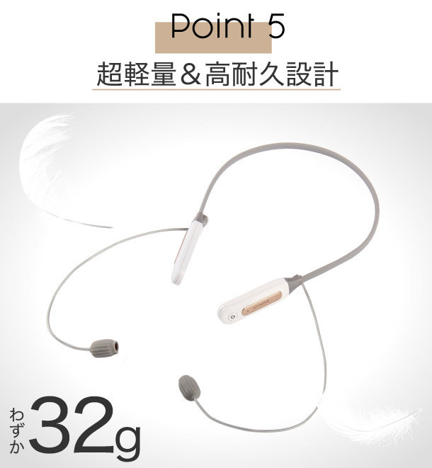 これだけのパフォーマンスを発揮しながら、重量はわずか32gと超軽量。デスクワークや移動でつけっぱなしでも気にならない重さです。激しい運動時にも邪魔にならないのはこの軽さだからこそなせる技と言えるでしょう。