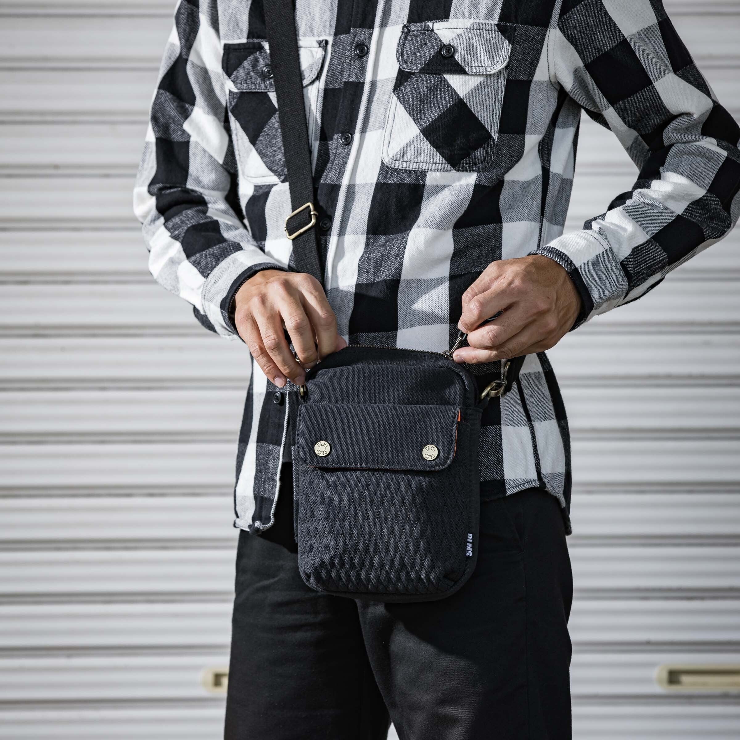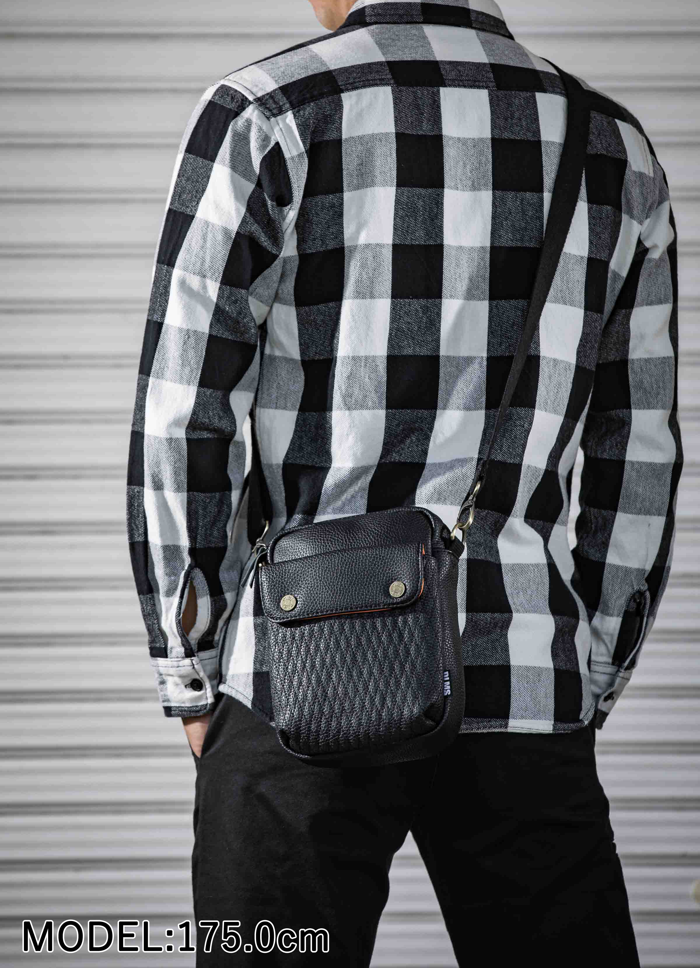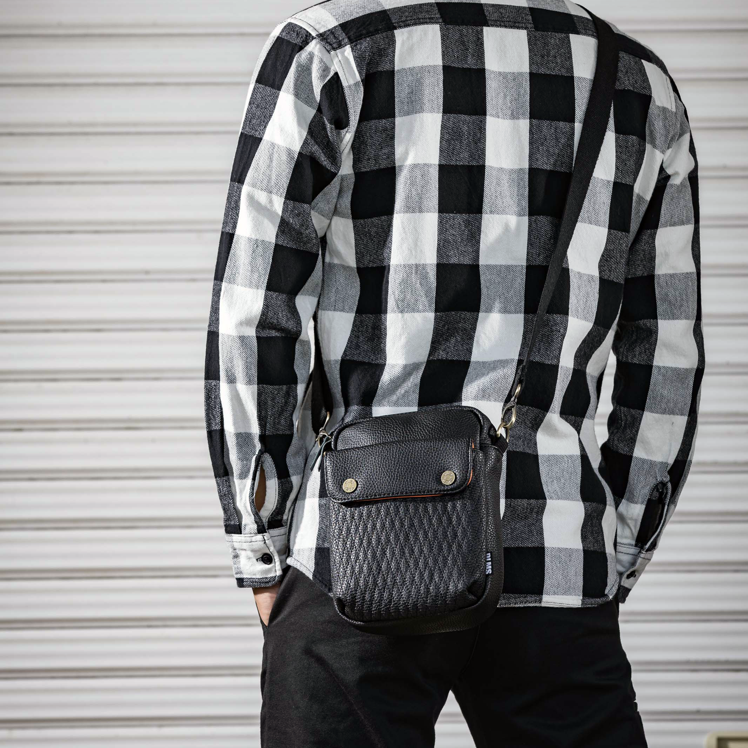 プロジェクトは、バイクにまたがっている時、街中を歩いている時、ペットとの散歩中でもスタイリッシュ&機能的で、よりカッコいいバッグを持ってもらいたいと思い、前面部に菱形のダイヤステッチを施した、デザインに特徴のある小さめのショルダーバッグを考案しました。