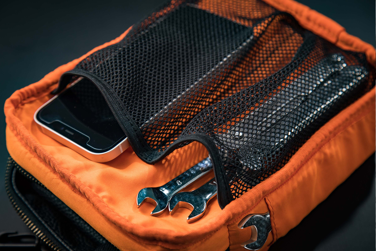 内装には必要最小限の工具やグローブなどを小分けする事ができるファスナーメッシュポケット付きです。