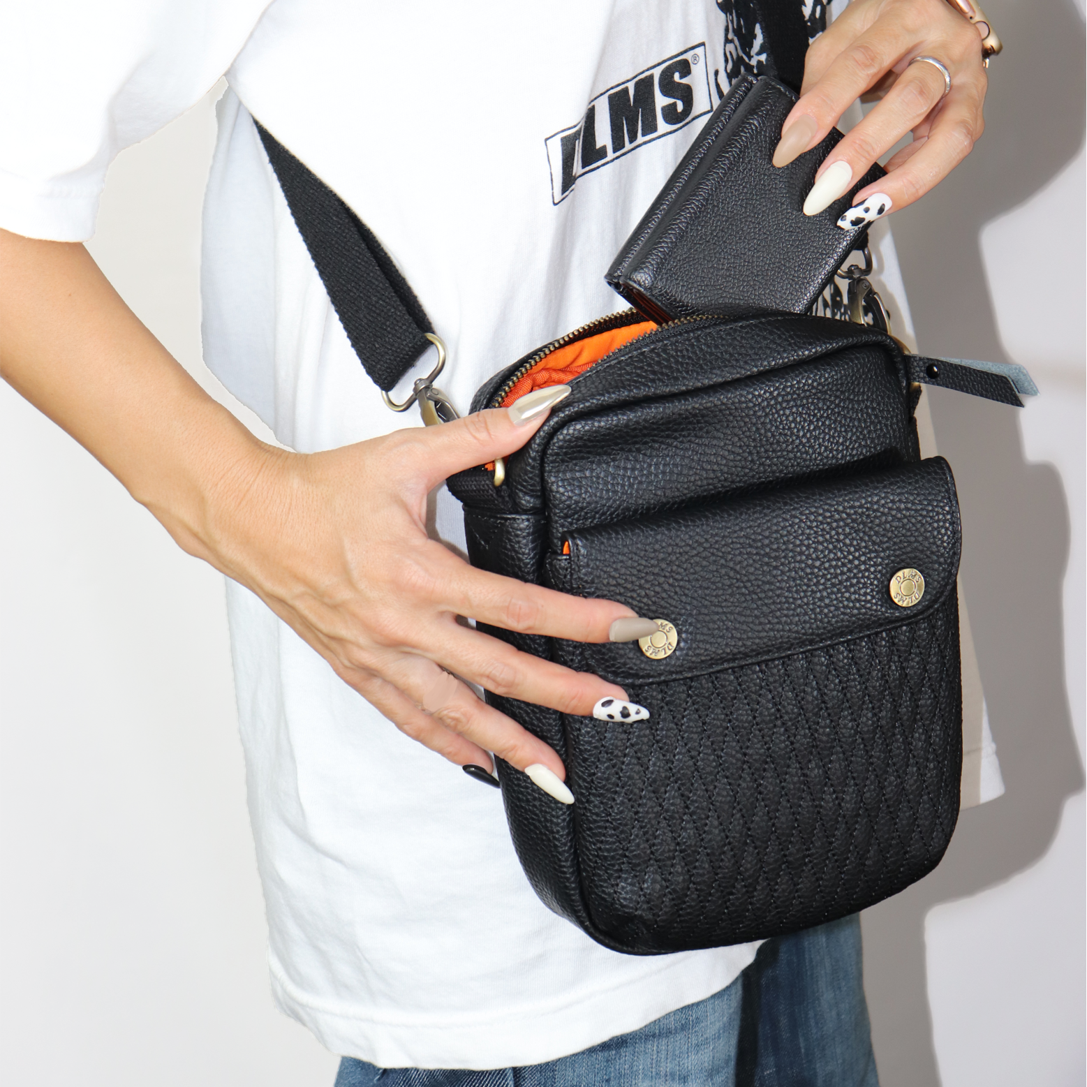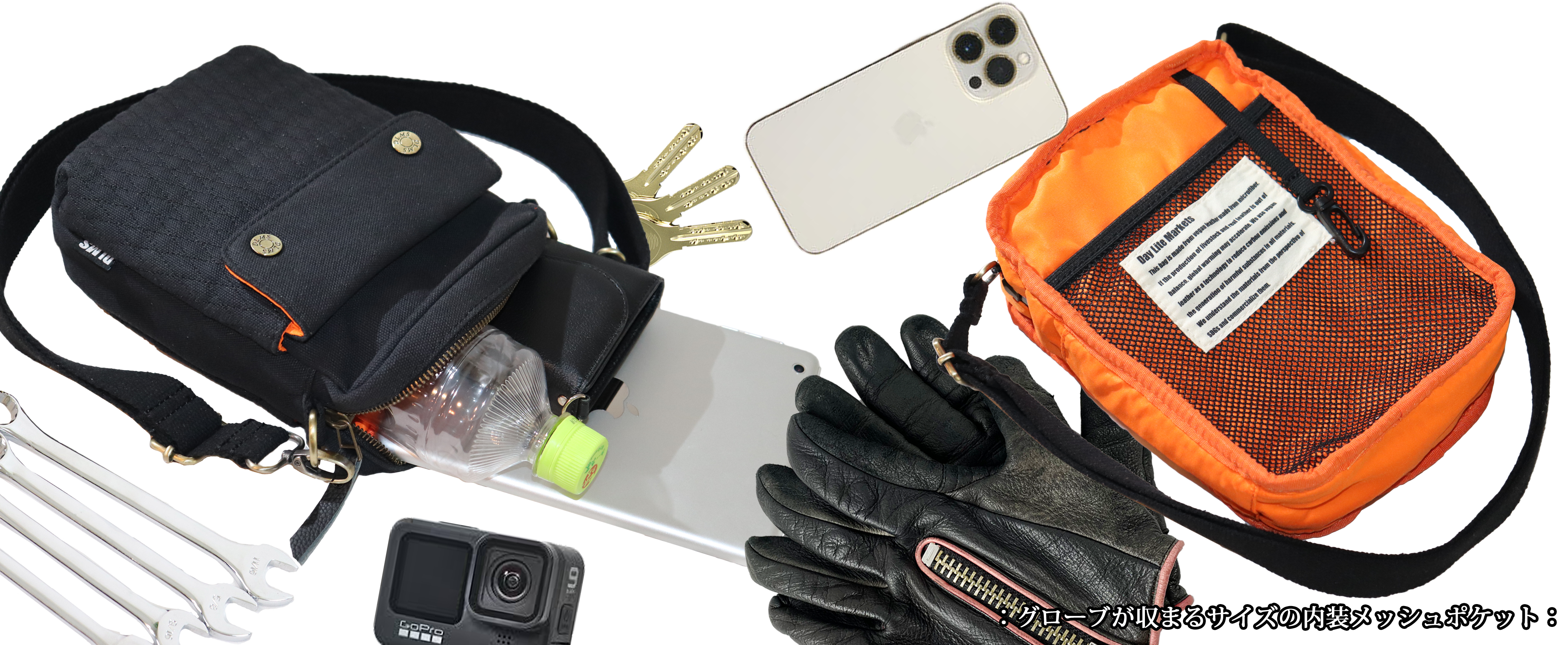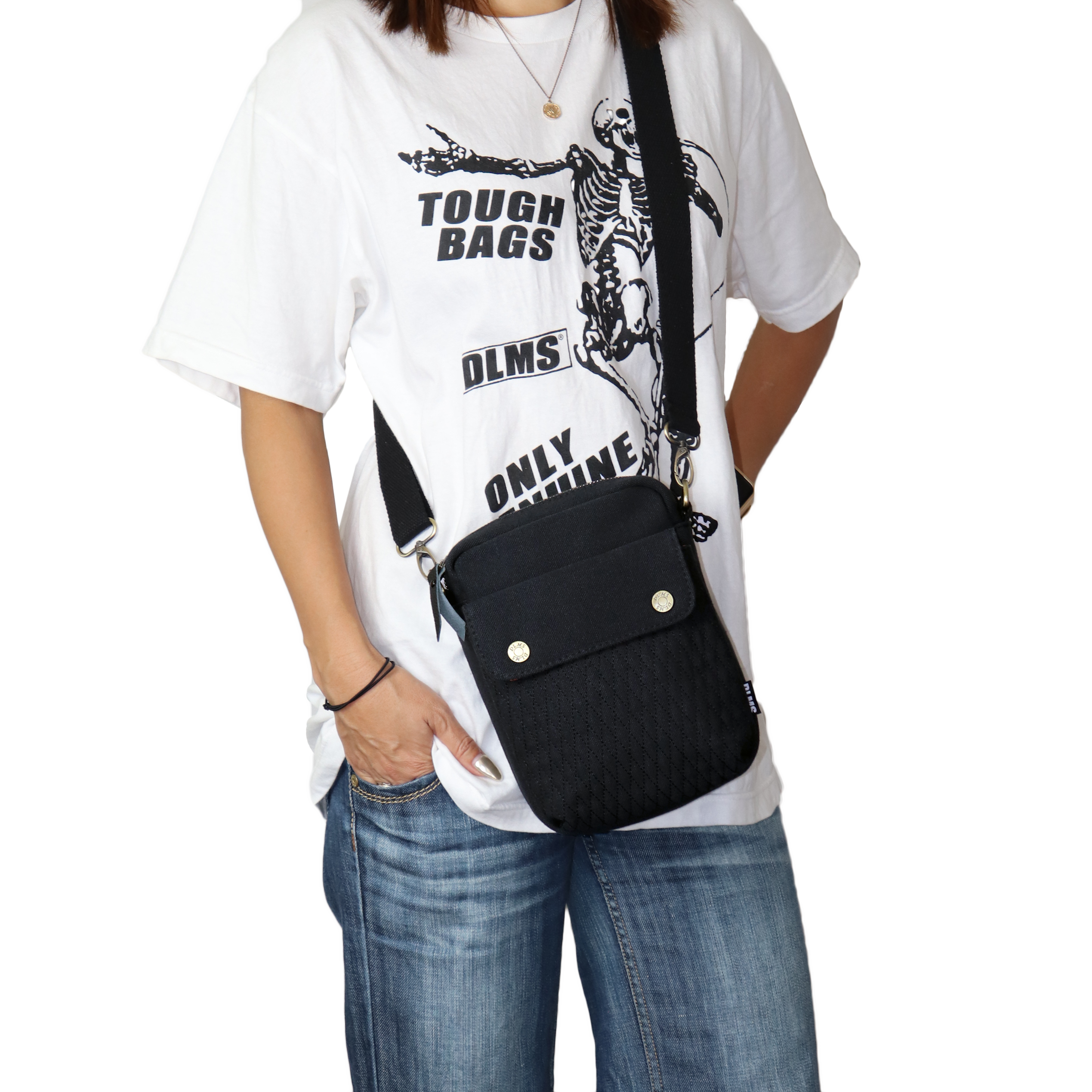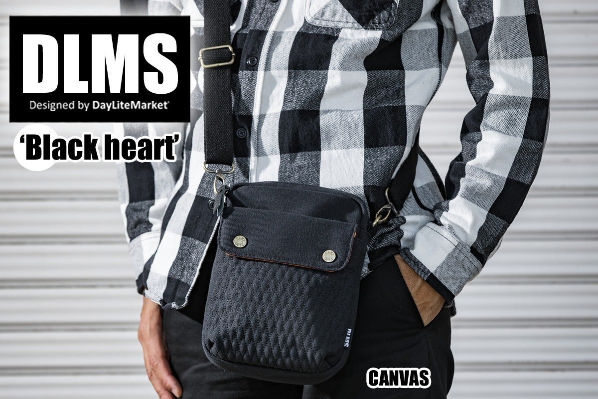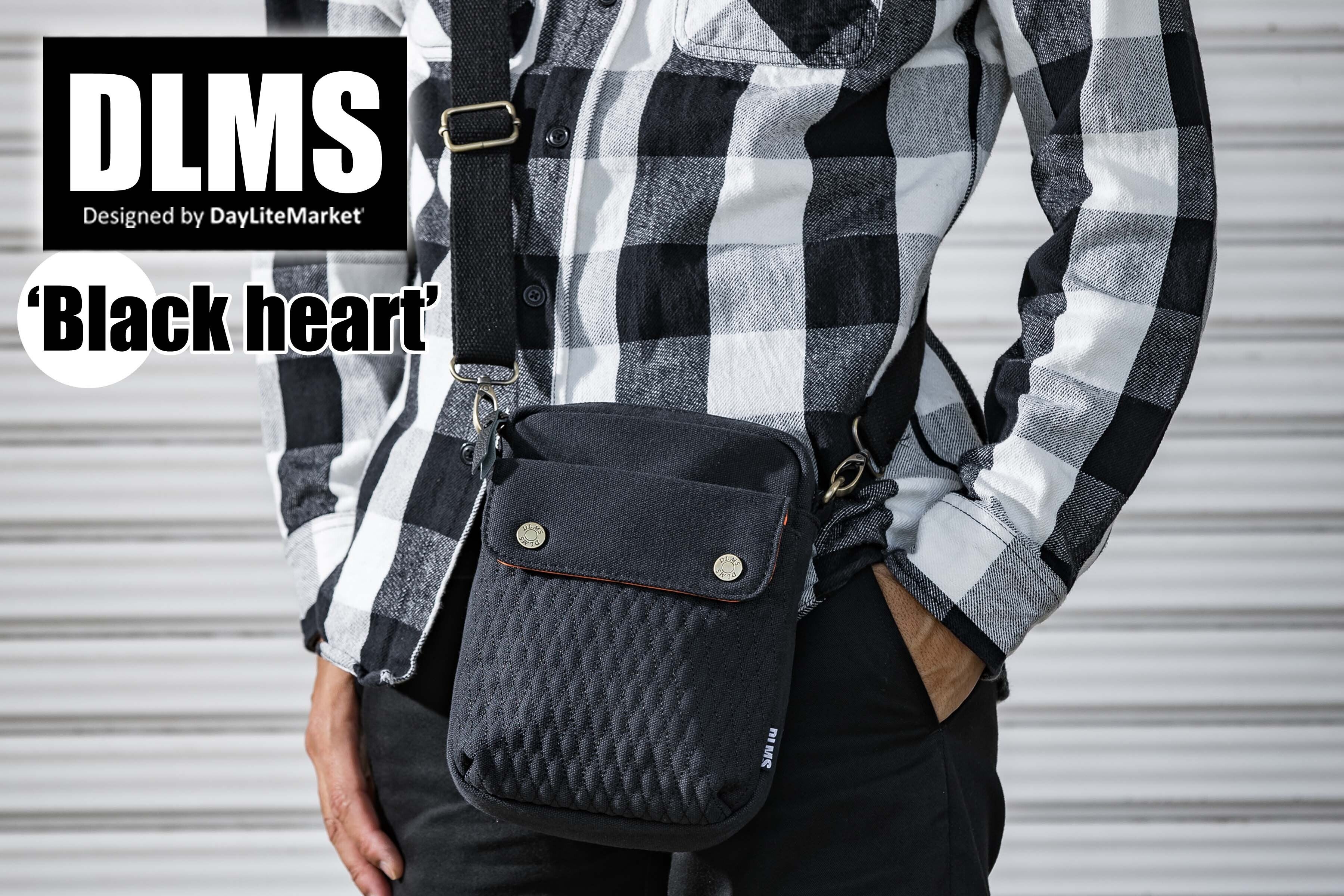 サコッシュは小さすぎるけどボディバッグは事足りている、または大きすぎる、服のポケットだけだと少し足りない。もちろんバイクに乗る時や普段使いにもカッコ良い物でないとダメだ! そんなかゆいところに手が届くサイズ感が丁度いい『DLMS』 'Black heart' ショルダーバッグです!!