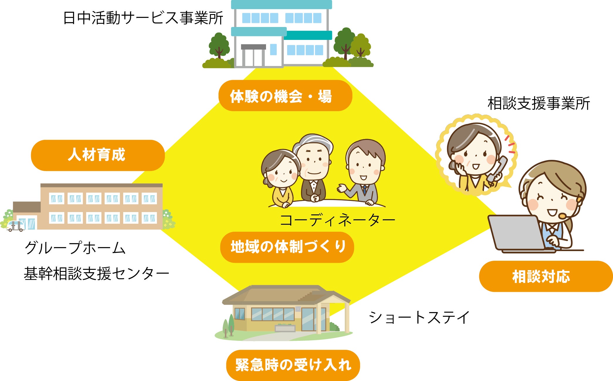 地域生活支援拠点のイメージ 出所:厚生労働省資料「地域生活支援拠点等好事例集」 を元に、きそがわ福祉会作成