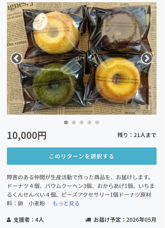 仲間が心をこめて作ったお菓子等を、リターンとしてお届けします。