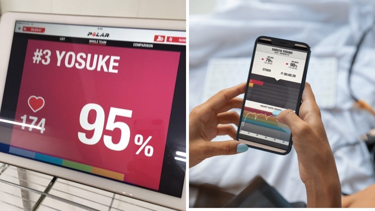 全てのクラスで心拍計を着用し大画面モニターで心拍数と消費カロリーを確認しながらトレーニングを行います。今までは自分の感覚で効果が分りづらかったものが可視化しながらトレーニングが出来ます。またトレーニング後も自分のスマホからトレーニング結果を見返すことが出来るため、トレーニング記録をつける習慣が身に付きます。