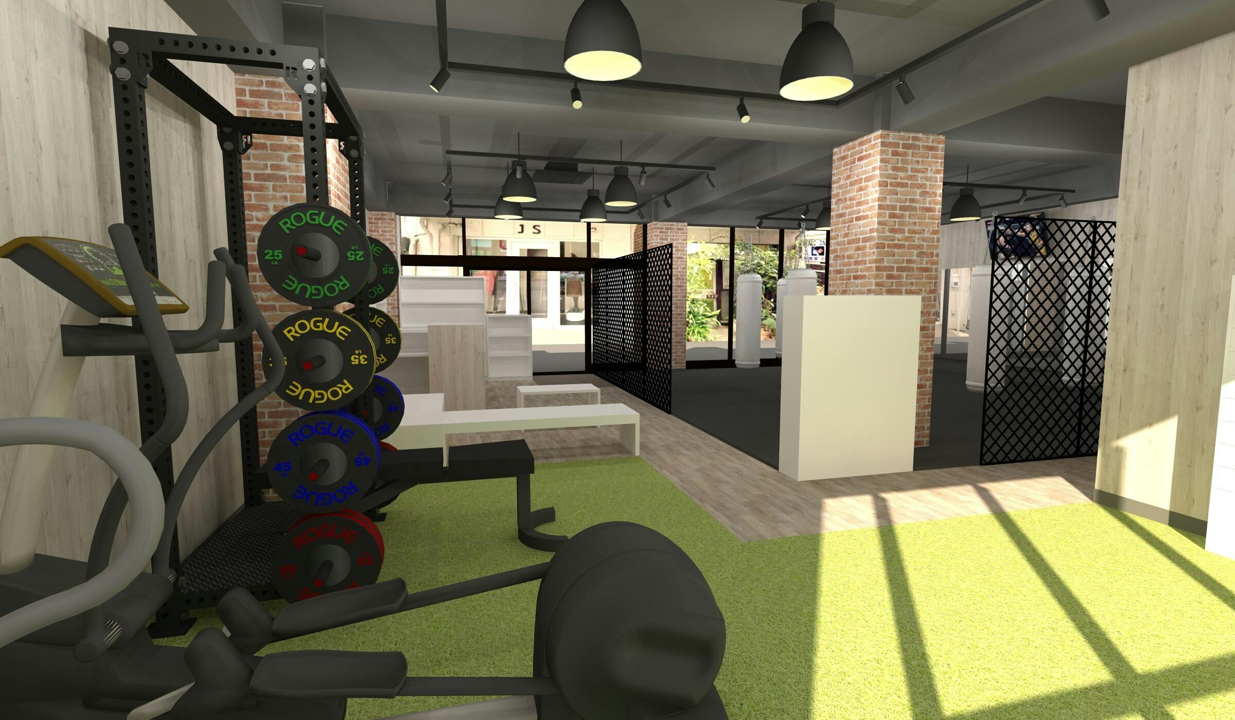 ジムは約40坪で天井約4mの海外ジムのような解放感ある、清潔でオシャレな非日常空間です。(マットスペース、ケージ、人工芝、ラウンジ、物販スペース、男女別更衣室があります)