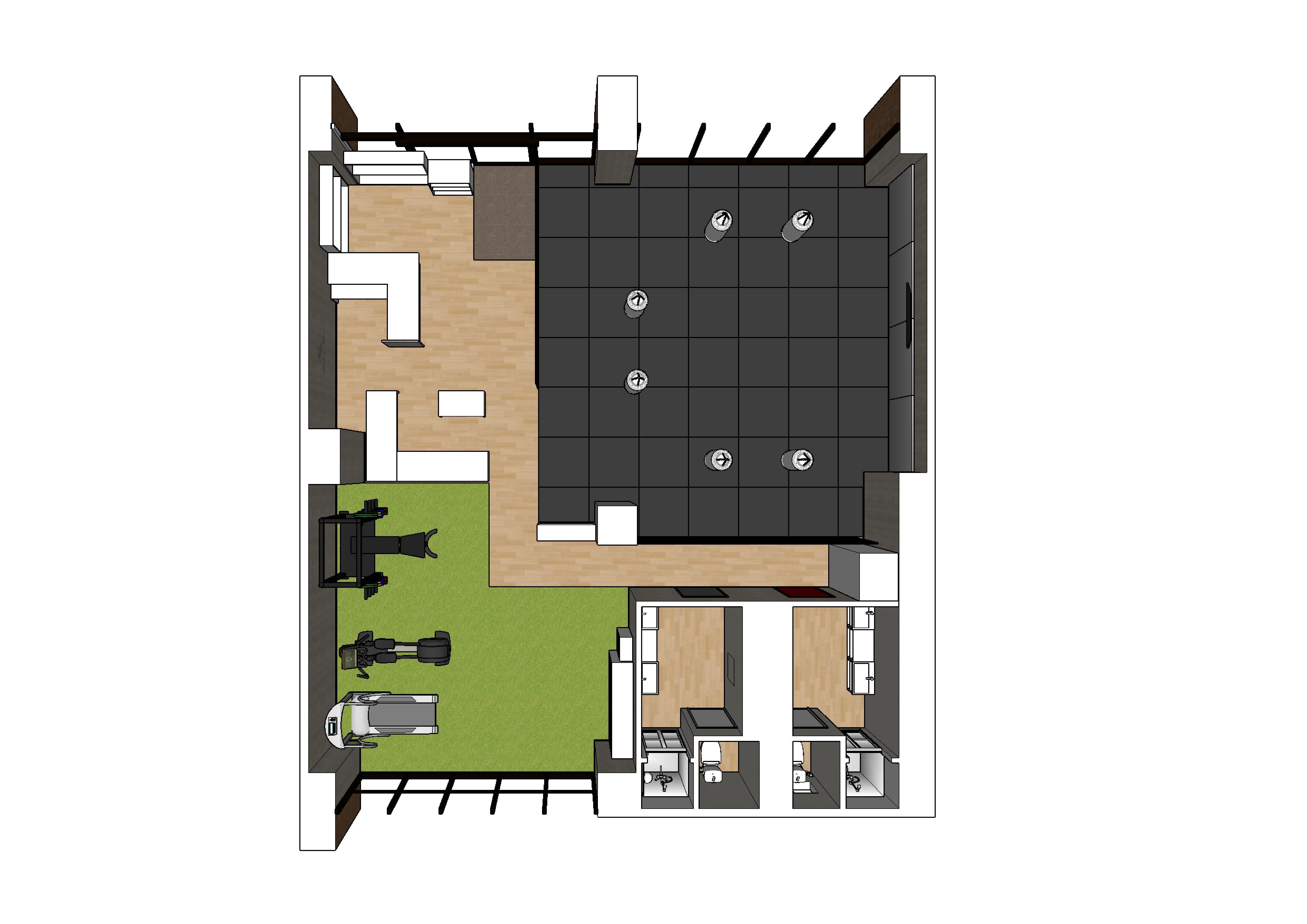 ジムは約40坪で天井約4mの海外ジムのような解放感ある、清潔でオシャレな非日常空間です。(マットスペース、ケージ、人工芝、ラウンジ、物販スペース、男女別更衣室があります)