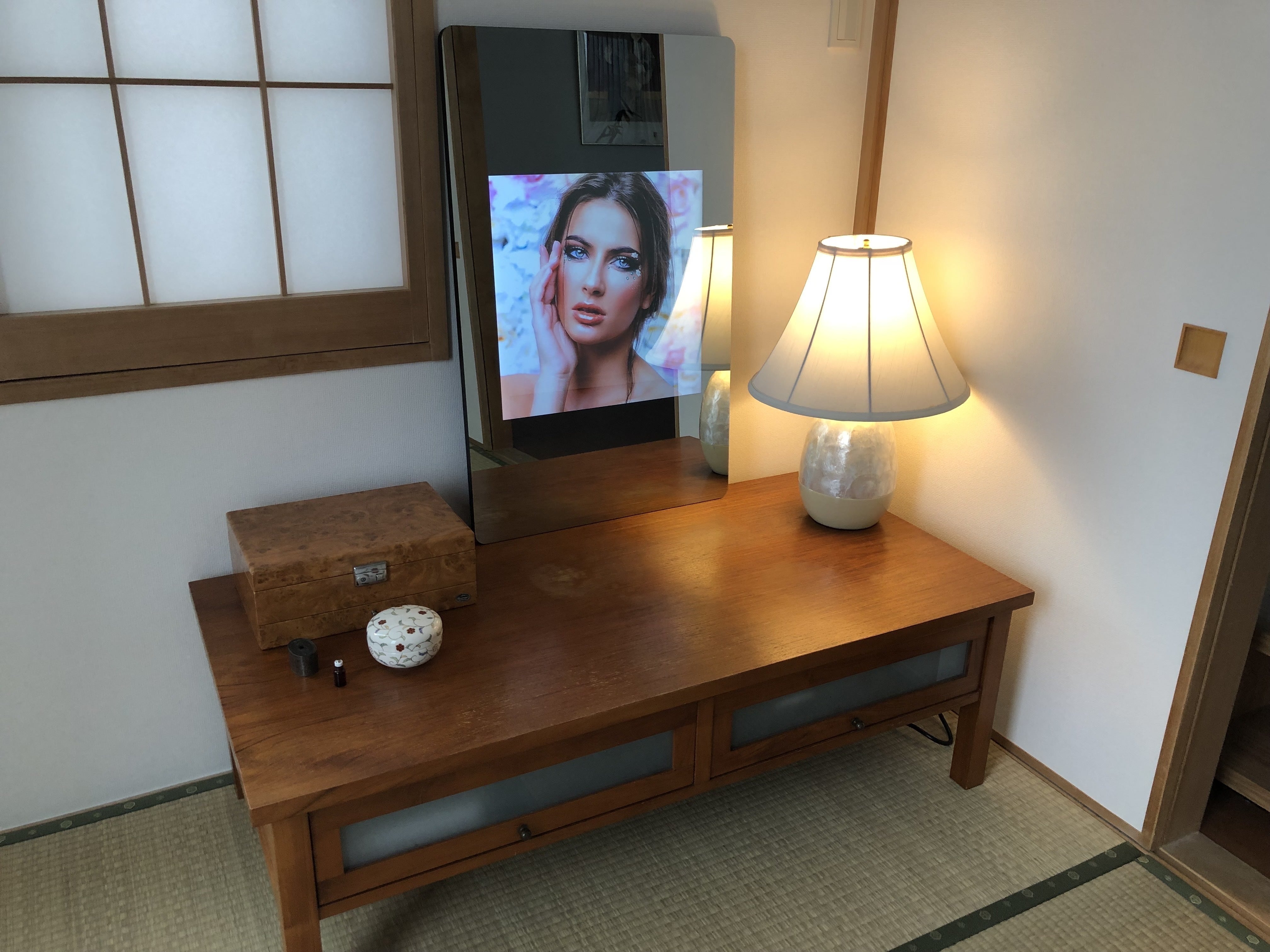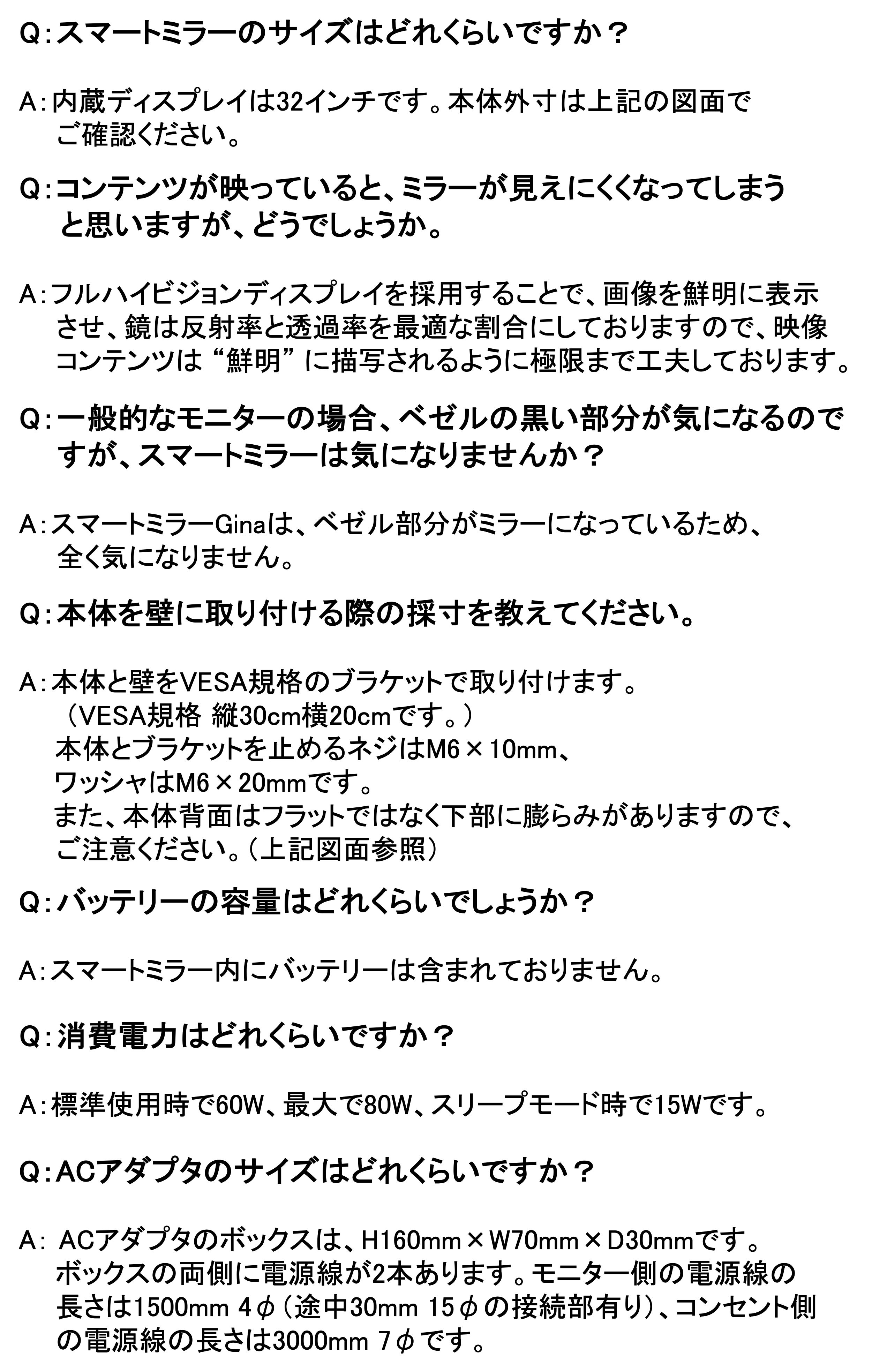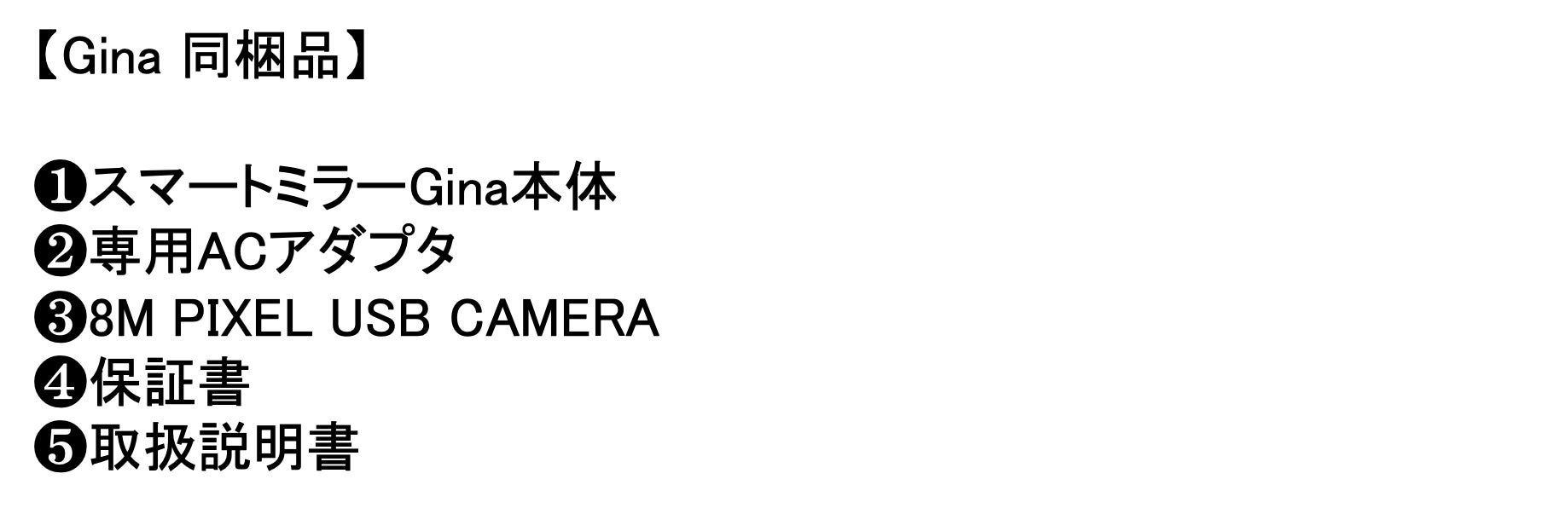 【Gina 同梱品】 ❶スマートミラーGina本体 ❷専用ACアダプタ ❸8M PIXEL USB CAMERA ❹保証書 ❺取扱説明書