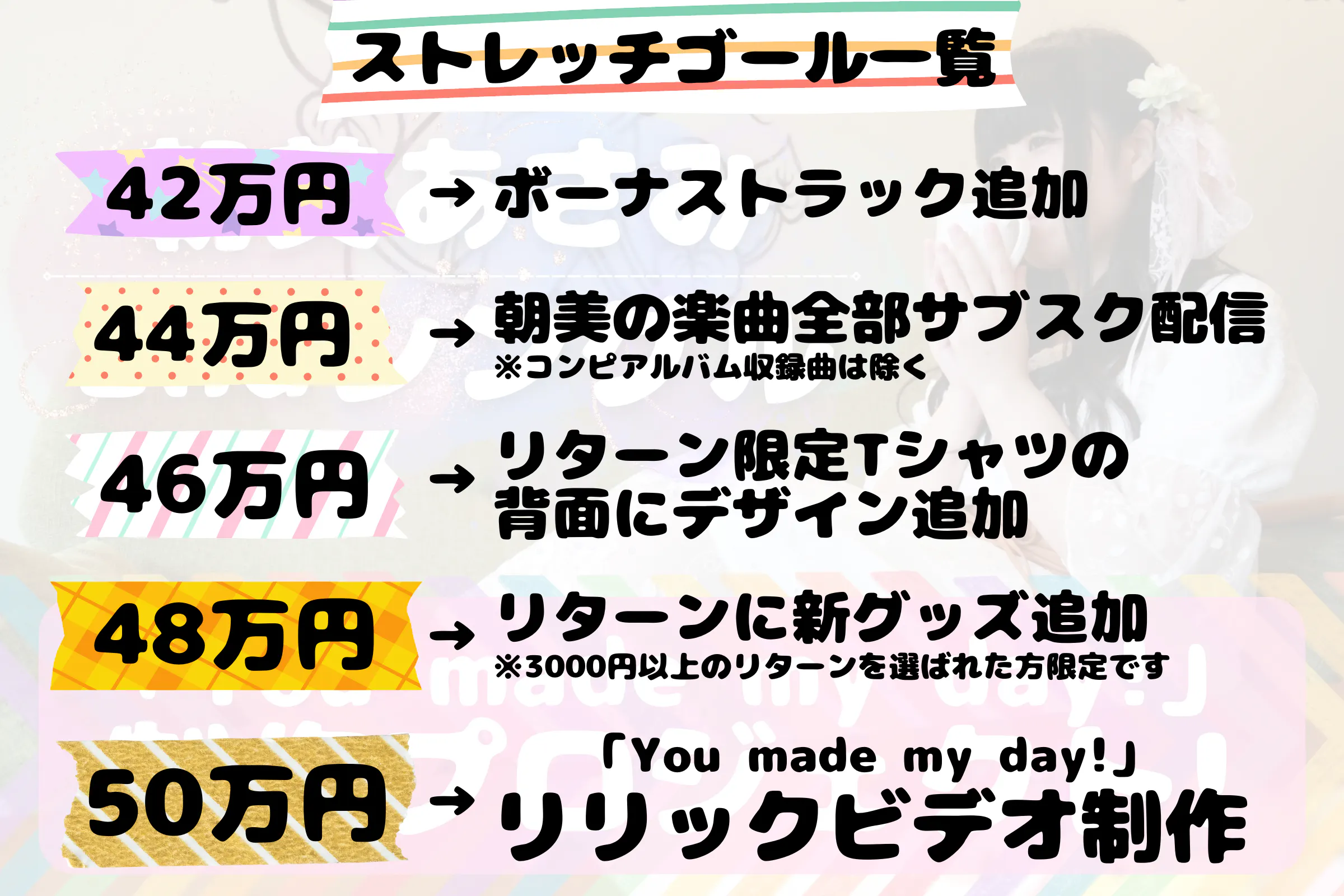 今回のストレッチゴールは、2023/1/29(日)に行われる私のライブ活動休止イベント「You made my day!」でフル活用できるような内容とさせていただきました。