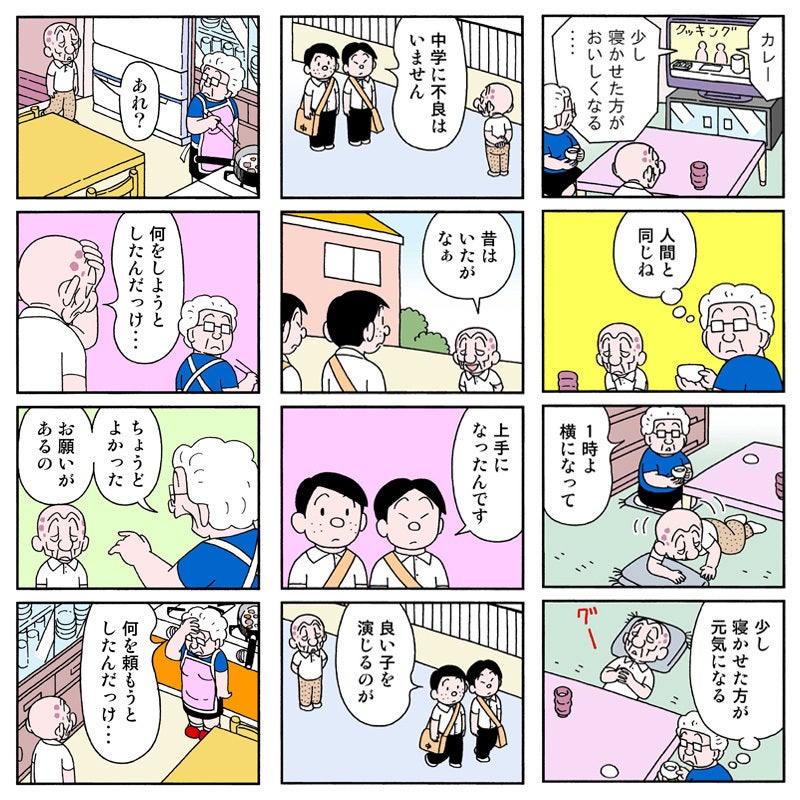 ほのぼのとした日々の暮らしをはじめ認知症や終活、入院生活など高齢者が直面する問題まで、さまざまなテーマを取り上げています。