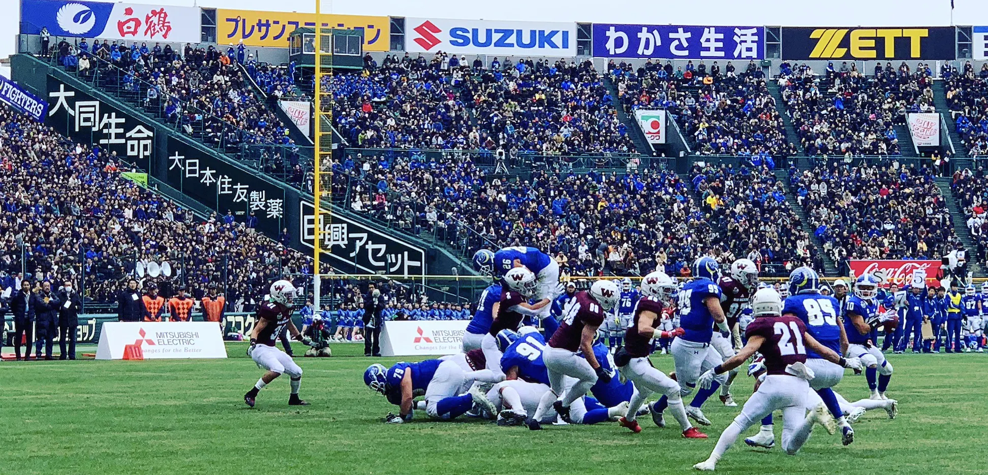昨年、甲⼦園ボウルは76回⼤会を迎え100回⼤会に向けて新たな25年のキックオフを致しました。固定されたスタジアム(地域)で歴史を重ねるボウルゲームという⽶国のアメリカンフットボール⽂化。⽇本でも唯⼀無⽐の存在となるこのボウルゲームは、1年に⼀度、この⽇だけに歴史ある甲子園球場の内野グラウンドに芝⽣を敷き、⾮⽇常の空間の中を作り上げます。