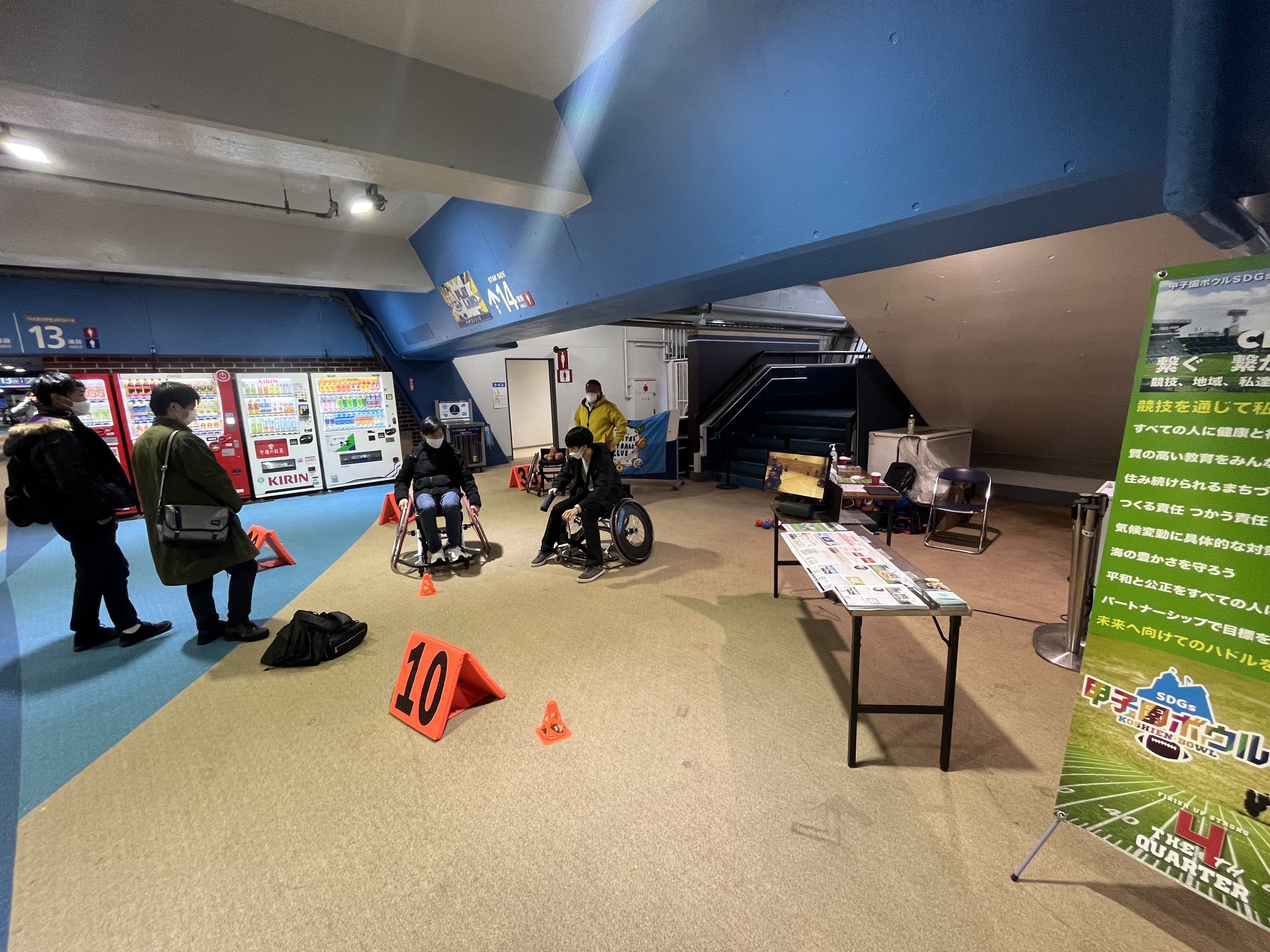 私たちは甲子園ボウルのSDGsプロジェクトの紹介のビデオやチラシなどをブースに訪れて下さった方々に配布し、又、スポーツ用車椅子に興味を持ってくださった方に実際に乗っていただきキャッチボールやボッチャなどを楽しみました。