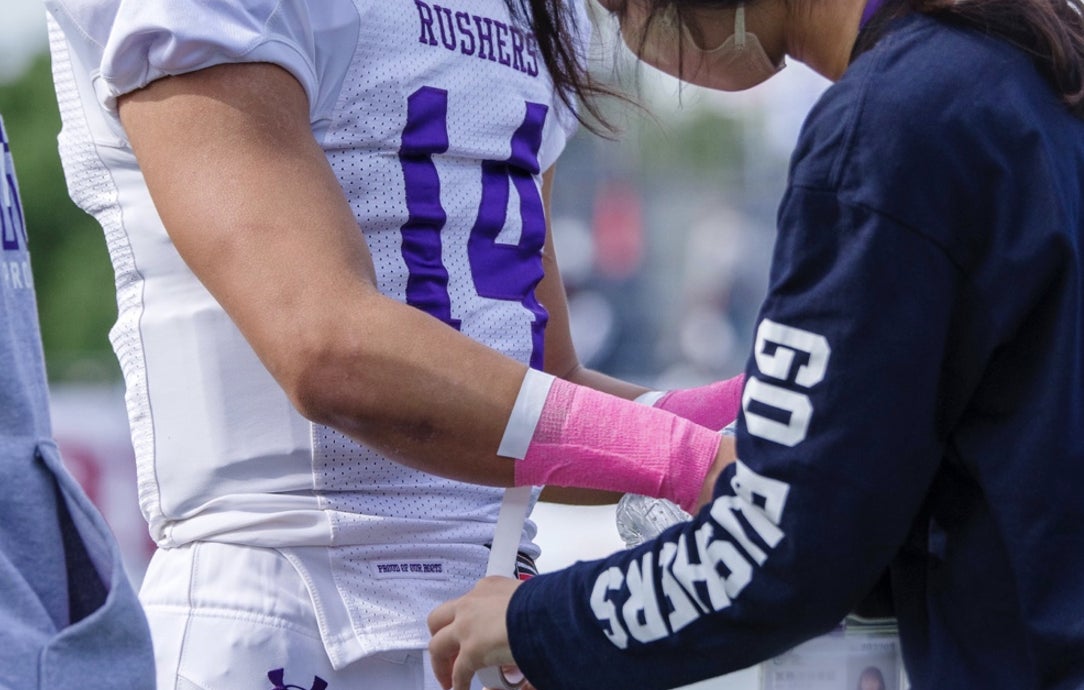 選手はピンク色のテーピング、スタッフ・コーチはリボンを装着して試合に臨みました。