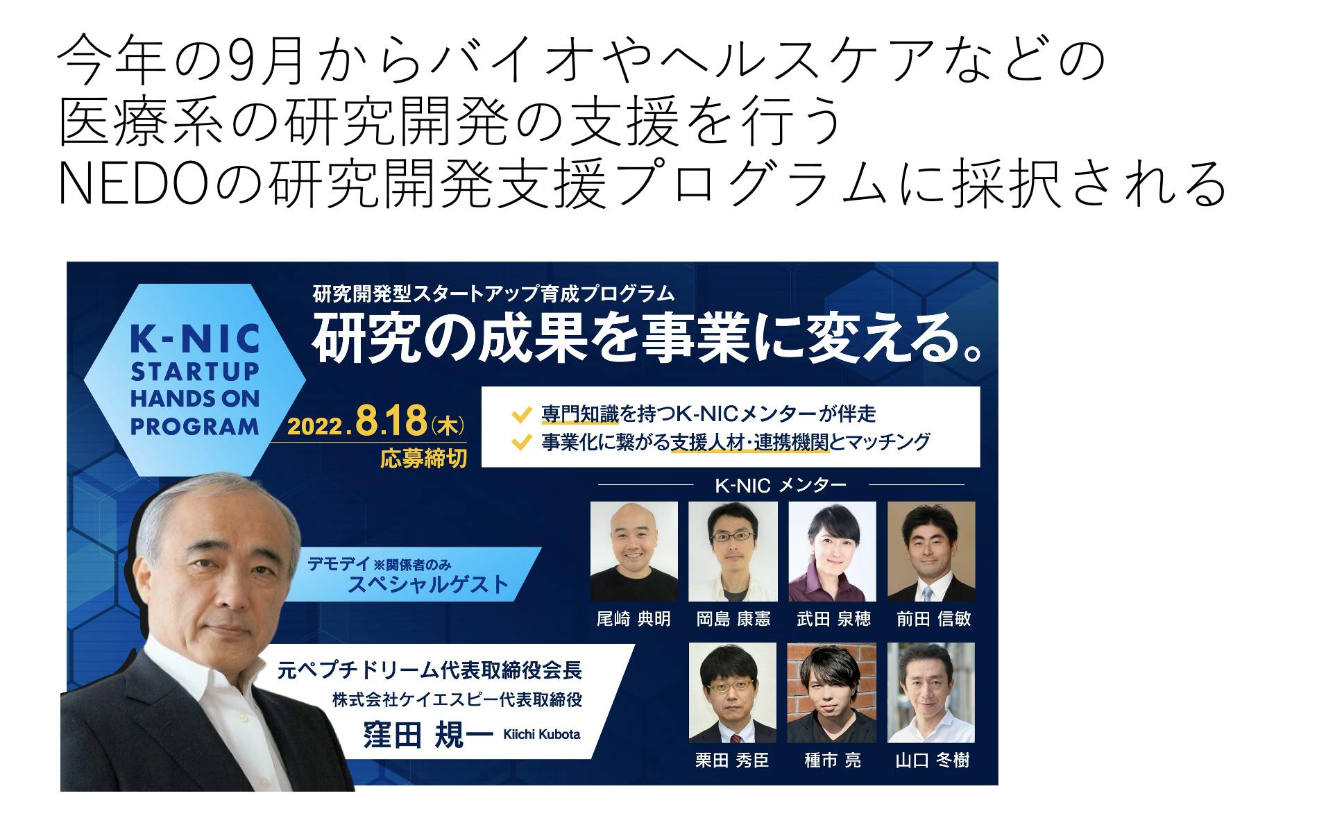 そして、今年、2022年の9月にはバイオや医療機器、遺伝子、ハードウェアなどの研究開発事業の社会実装を目指し、医療機器やハードウェアの専門家がメンターにつき、2ヶ月間、サポートしてもらえ、NEDO 、川崎市、川崎市産業振興財団が共同運営する「KNIC-StartupHandsOnProgram」にも21社の応募の中から、8社の採択企業のうちの1つに採択されました。