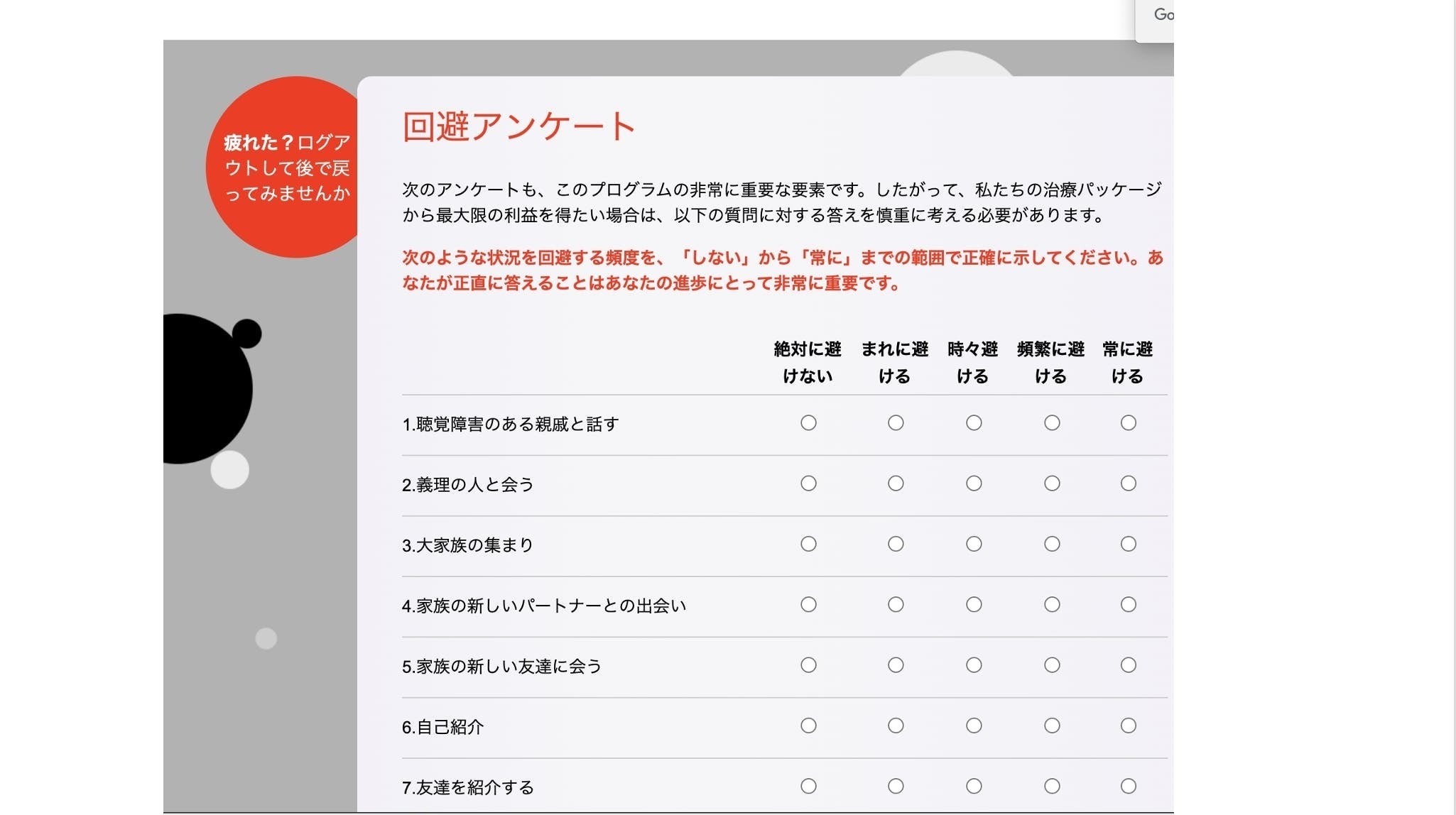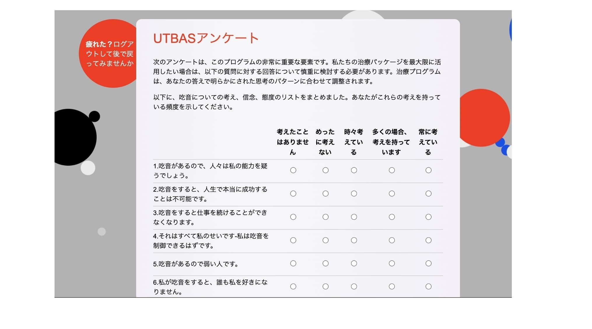 VRを医療応用する上で必要不可欠となる吃音症状や吃音の悩み度合いの数値化、それを既存の質問紙をベースに、webやスマホのアプリとしてデジタル化するための研究開発費。(写真は海外のシドニー工科大学で開発されている吃音の質問紙をアプリ化したものになります)