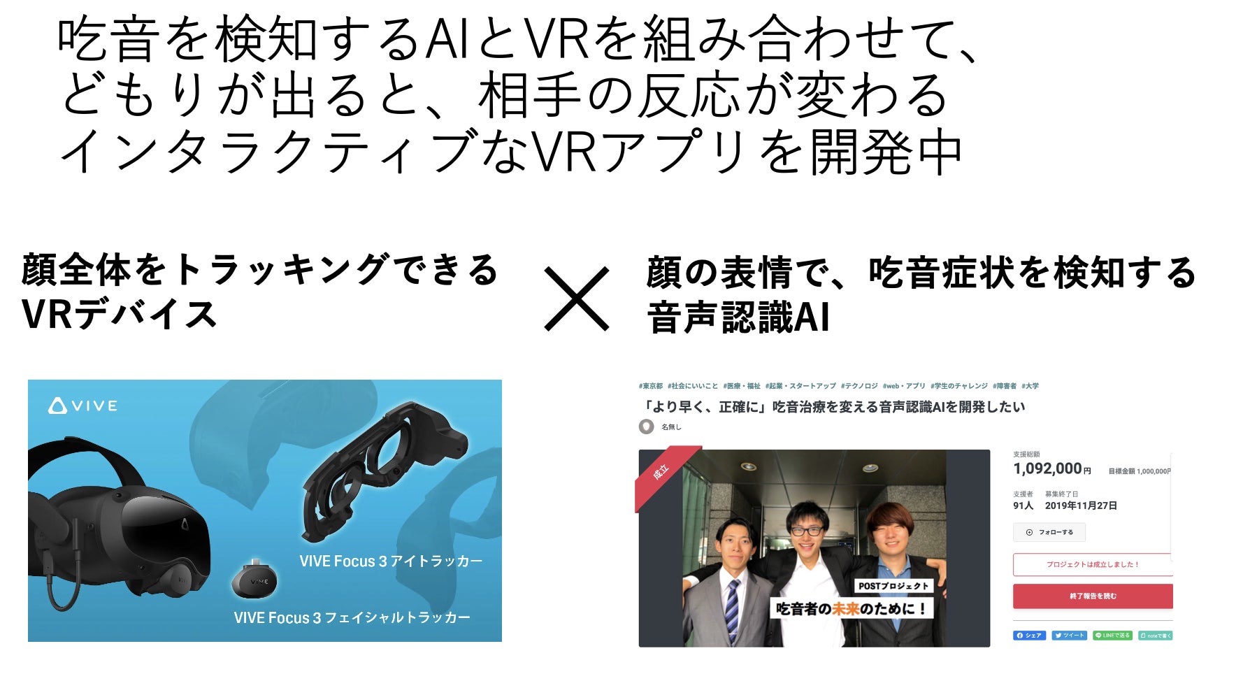 加えて、吃音の症状を検知するAIがあるのですが、それを今のVRプログラムに組み込む、そのための開発費、この2つを実現するために350万を目指します!