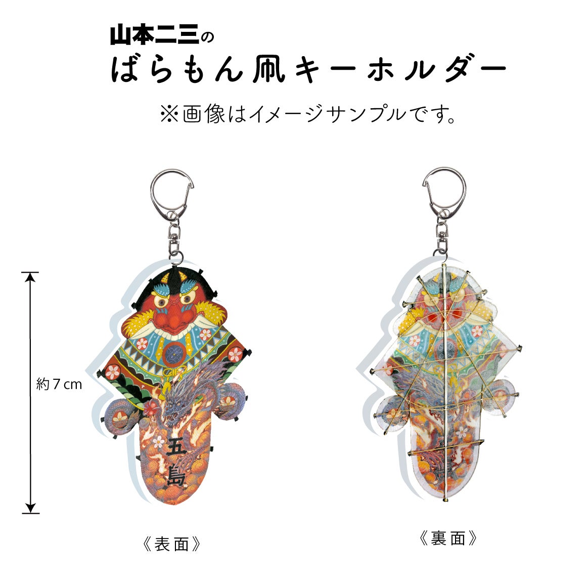 これは「ばらもん凧」という五島の民芸品です。凧の本体は五島の職人さんに作っていただき、デザインと絵付けを山本二三が行いました。上半分は伝統的なデザインを参考にしていますが、下半分は山本二三のオリジナルです。こちらも「五島百景 飯能展」でご覧いただけますので、ぜひお楽しみにご来場ください。